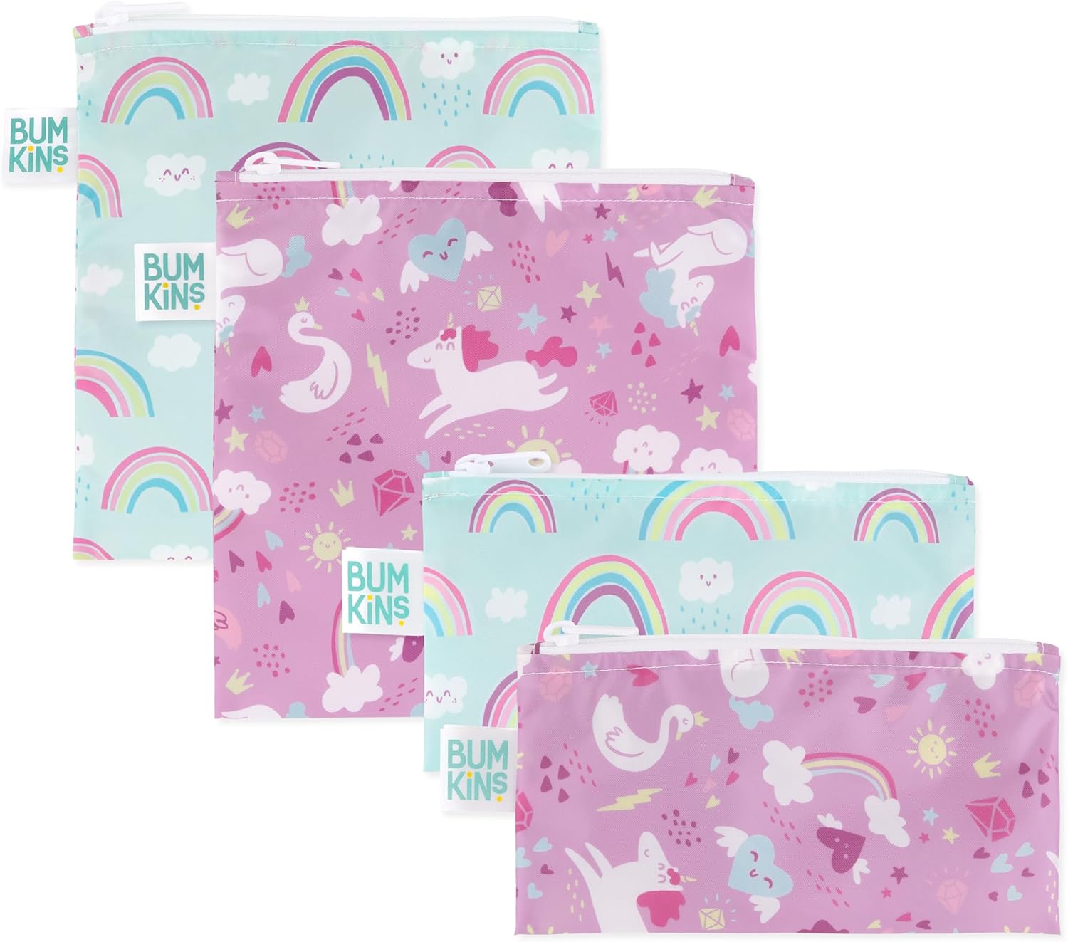 Bumkins - Cloth Snack & Sandwich Bags - For Storage, Travel, Food Prep, Lunch - Reusable, Water Resistant, Washable, Dishwasher Safe - Snack Bags for Kids - Zipper Closure -Unicorns & Rainbows -4 Pack