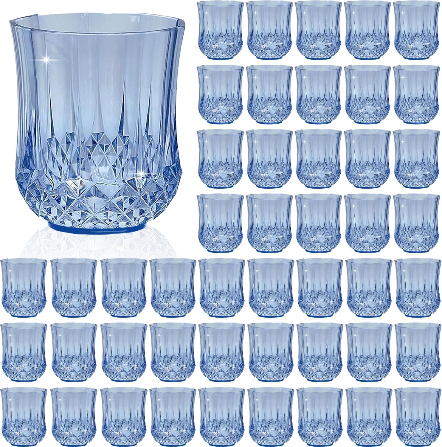 48 PCS Blue Stemless Wine Glasses,Plastic Reusable Cups 9OZ Vintage Drinking Glasses Tumblers for Whisky, Beer, Juice, Beverages, Cocktai