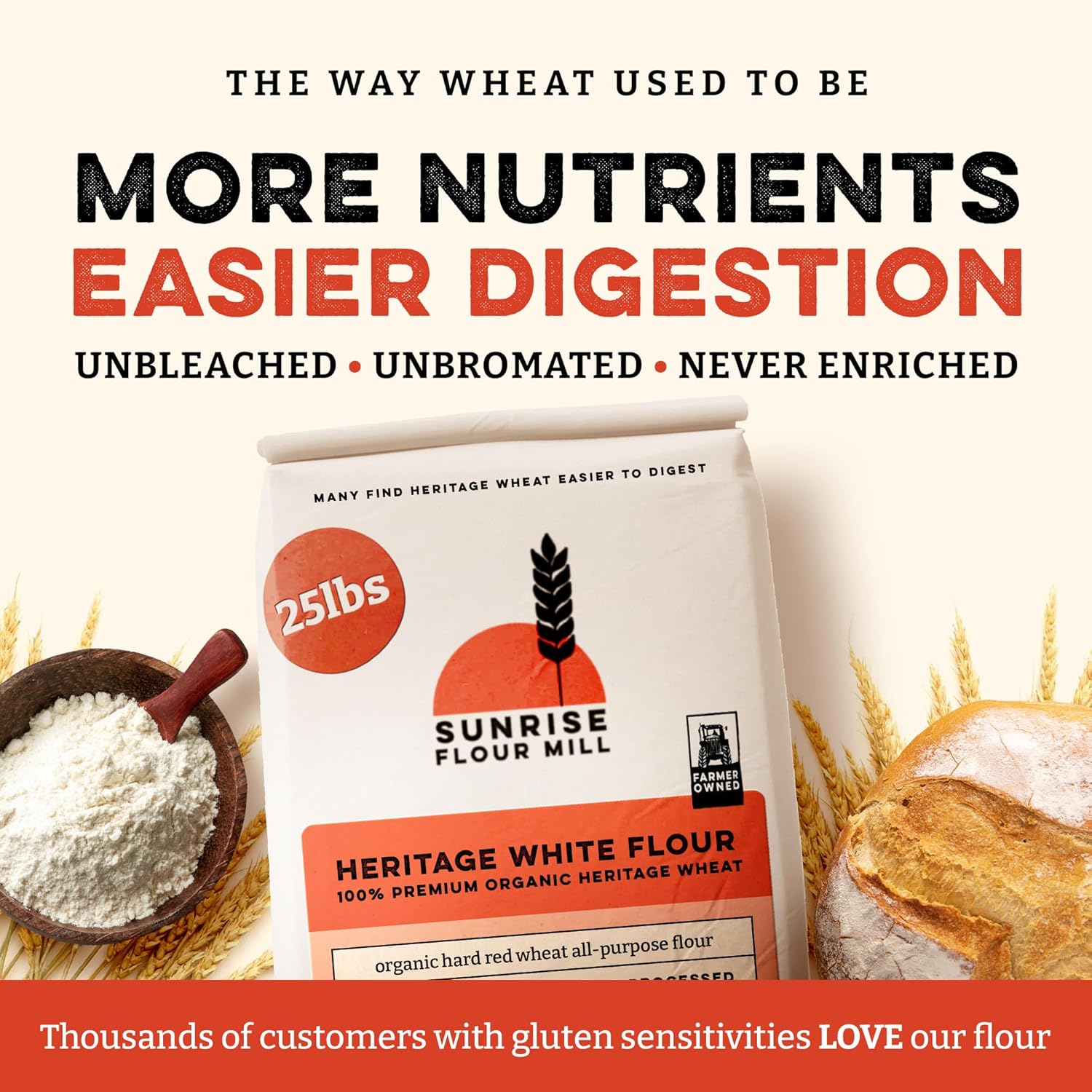Sunrise Flour Mill Heritage Organic White Flour | USDA Organic All Purpose Flour Unbleached - Non-GMO, Kosher, Glyphosate Free, High Protein for Baking, Unbromated White Wheat (400 Ounce (Pack of 1))