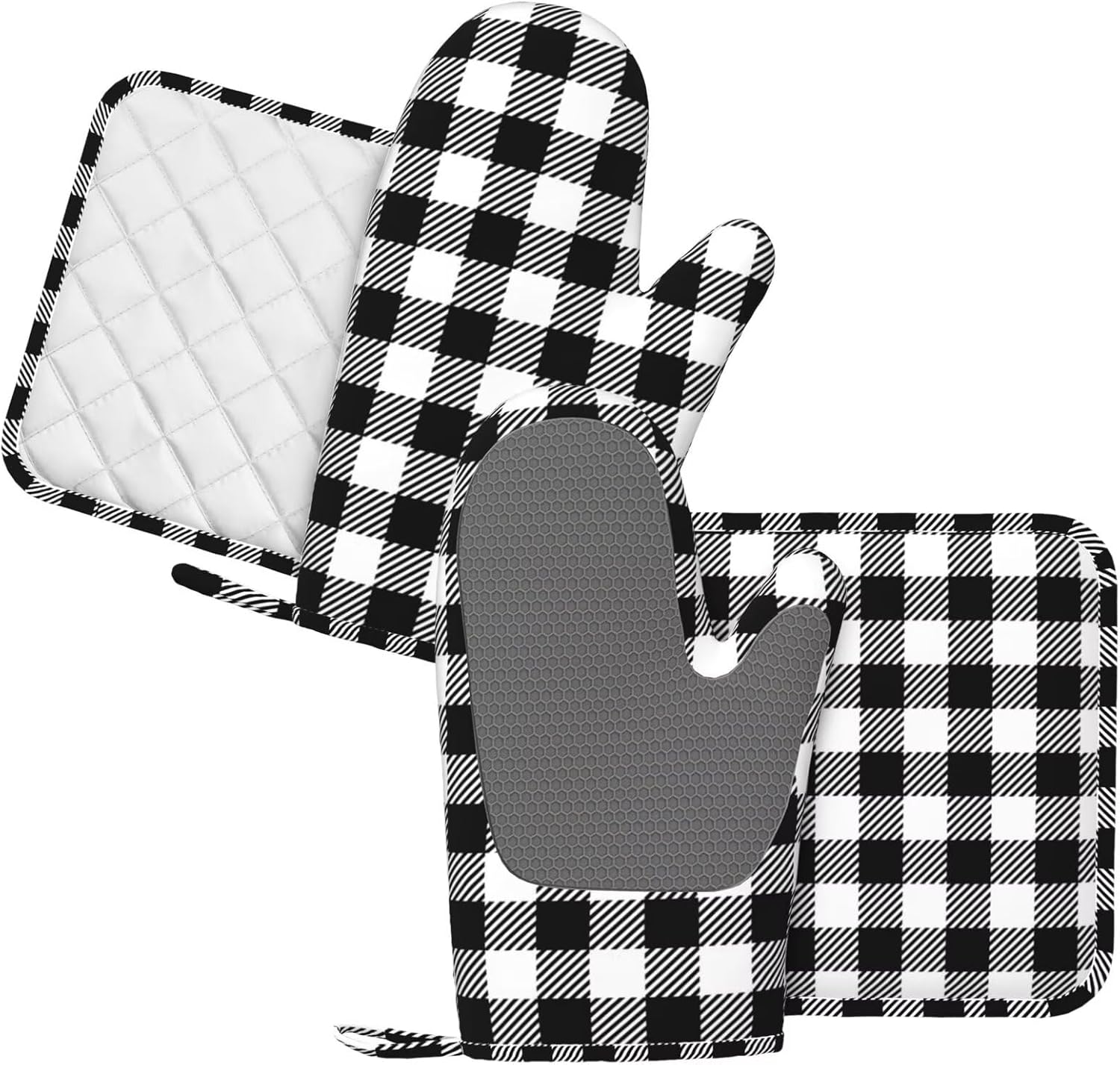 - NON-SLIP GRIP: The gingham plaid check black oven mitts feature a textured, non-slip surface that enhances your grip and control when handling hot items. This provides you with a secure hold, reducing the risk of accidental slips or drops while transferring dishes from the oven or stovetop