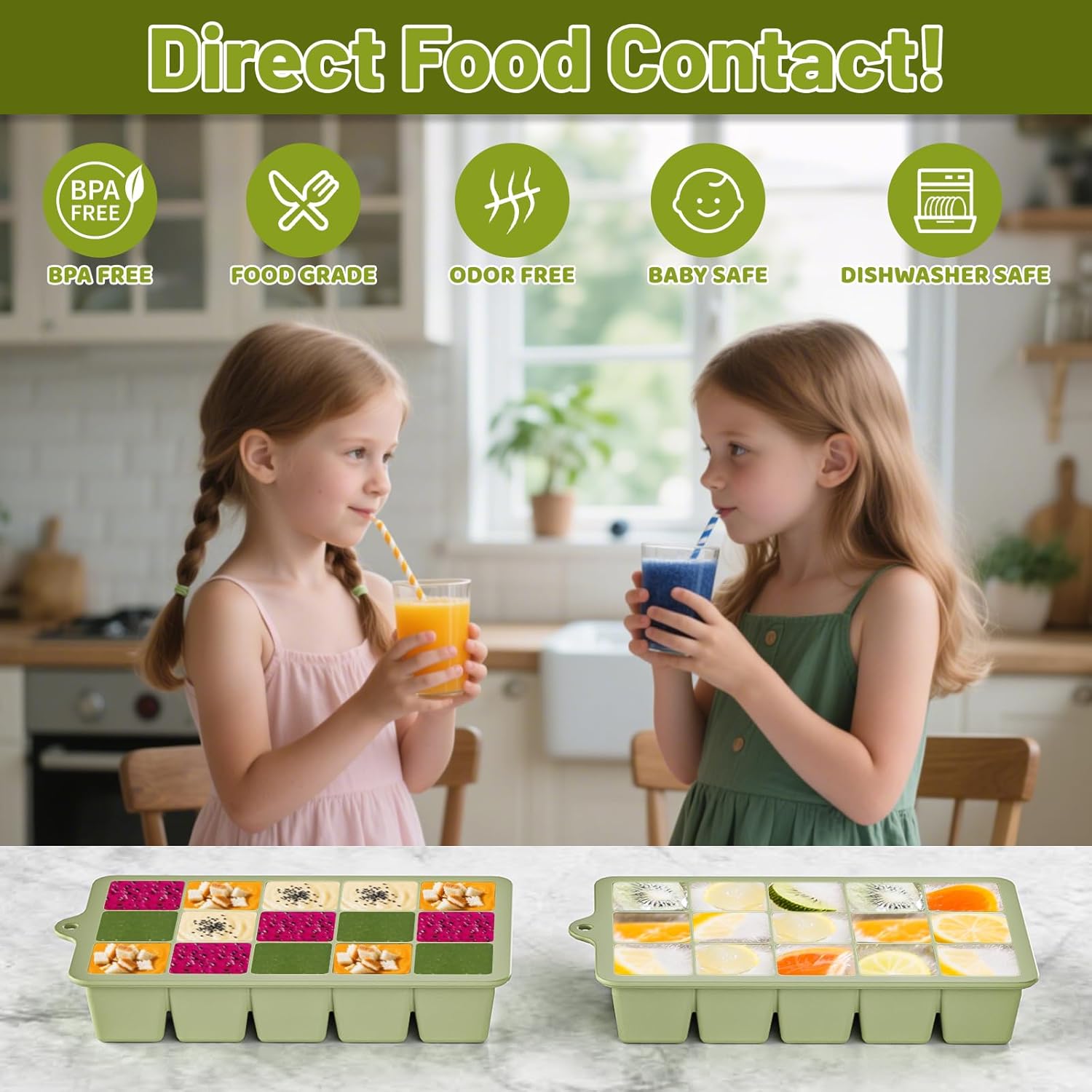 - FOOD GRADE SILICONE: The silicone ice cube trays are made of food grade silicone,they can directly contact food,BPA free,Non toxic,durable safety and odorless,Resistant to high or low temperatures,work good for dishwashers, microwaves, and refrigerators.