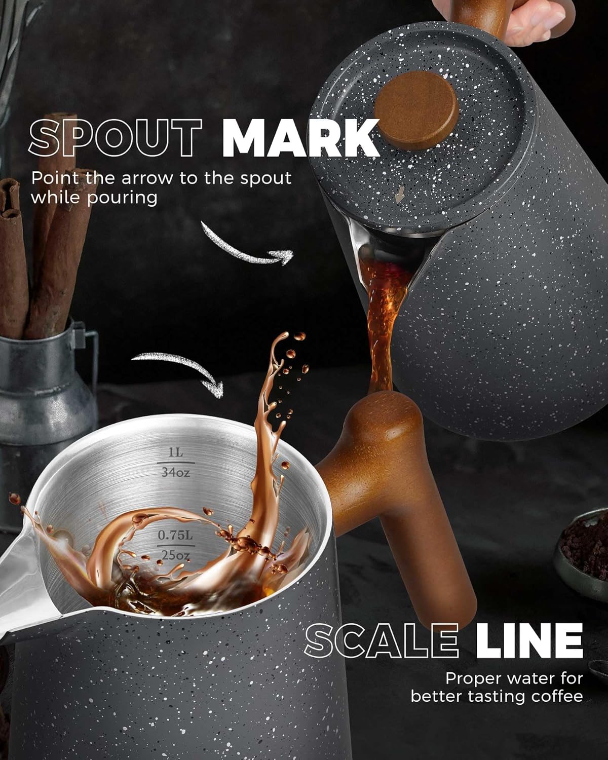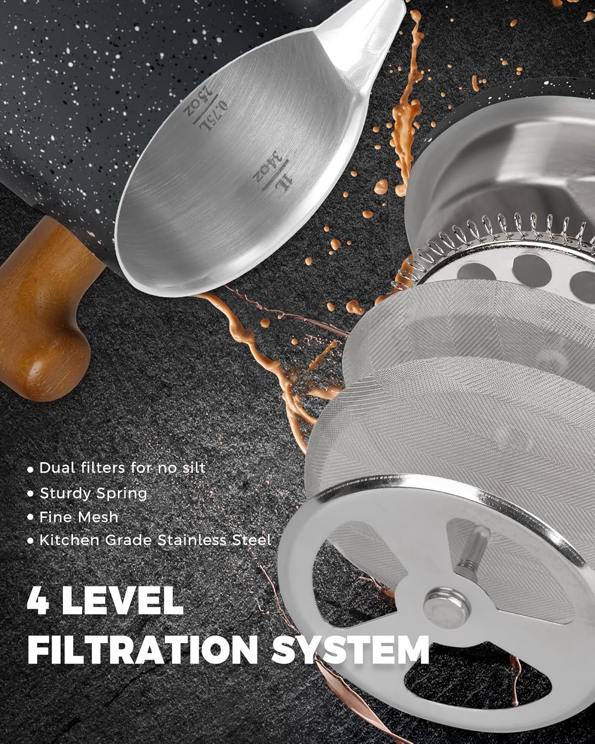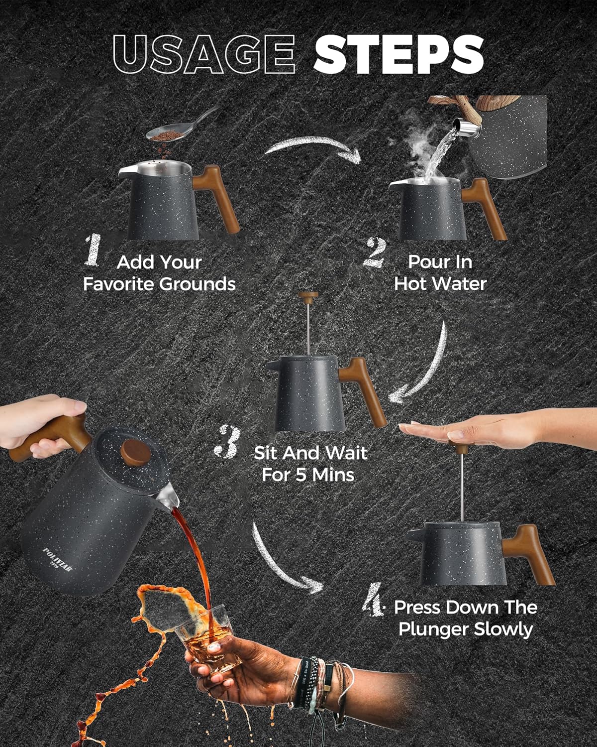 - LOOKING FOR COFFEE PRESS FOR MATCHING UP YOUR KITCHEN? We, the POLIVIAR french press coffee maker will be your smart choice. While the coffee pot is made from food grade stainless steel with stylish long-lasting coating, It is easily to match up your kitchenwares and your kitchen's theme. Also, the ergonomic handle with real wood will maximize the fantastic time of grounds you loved.