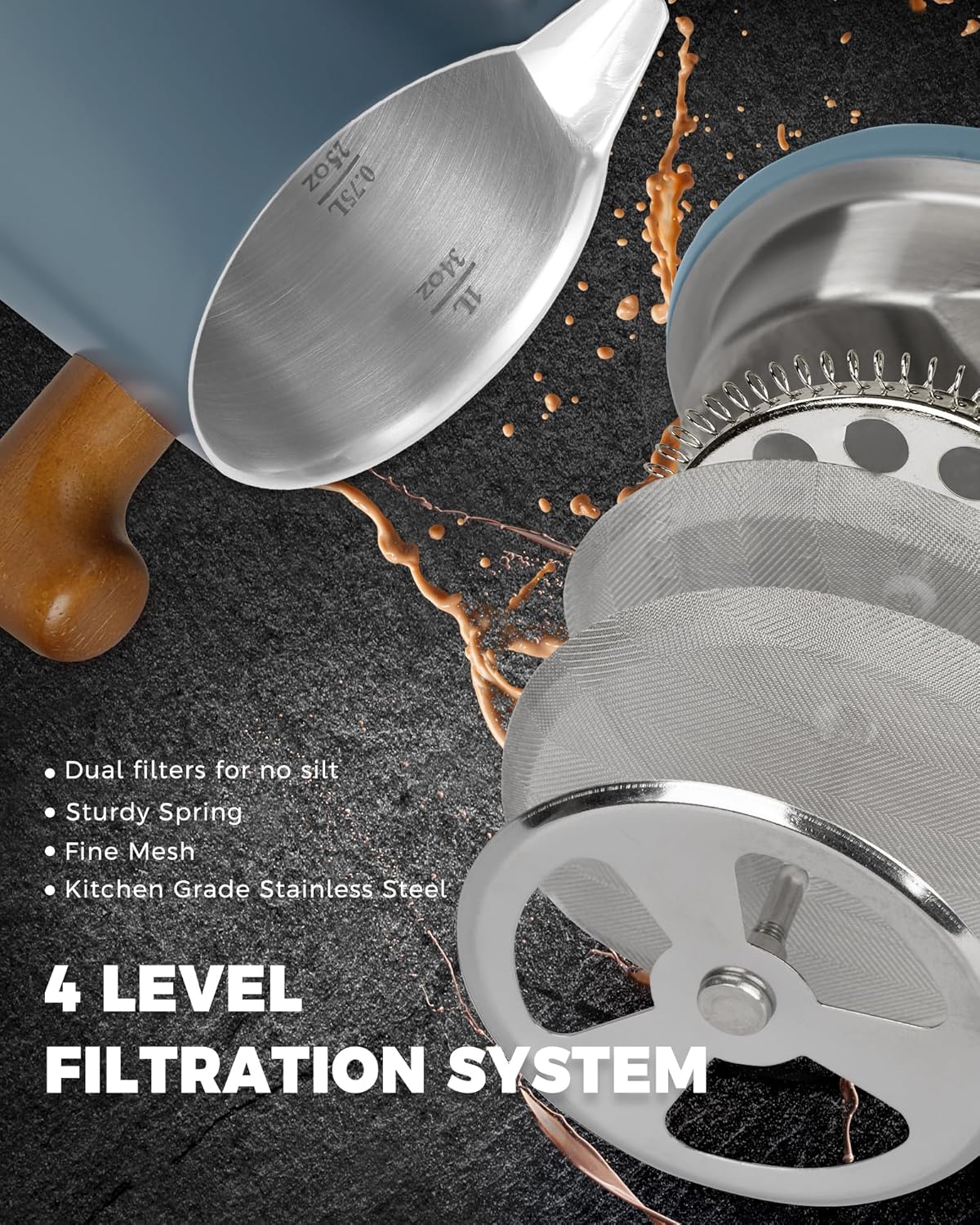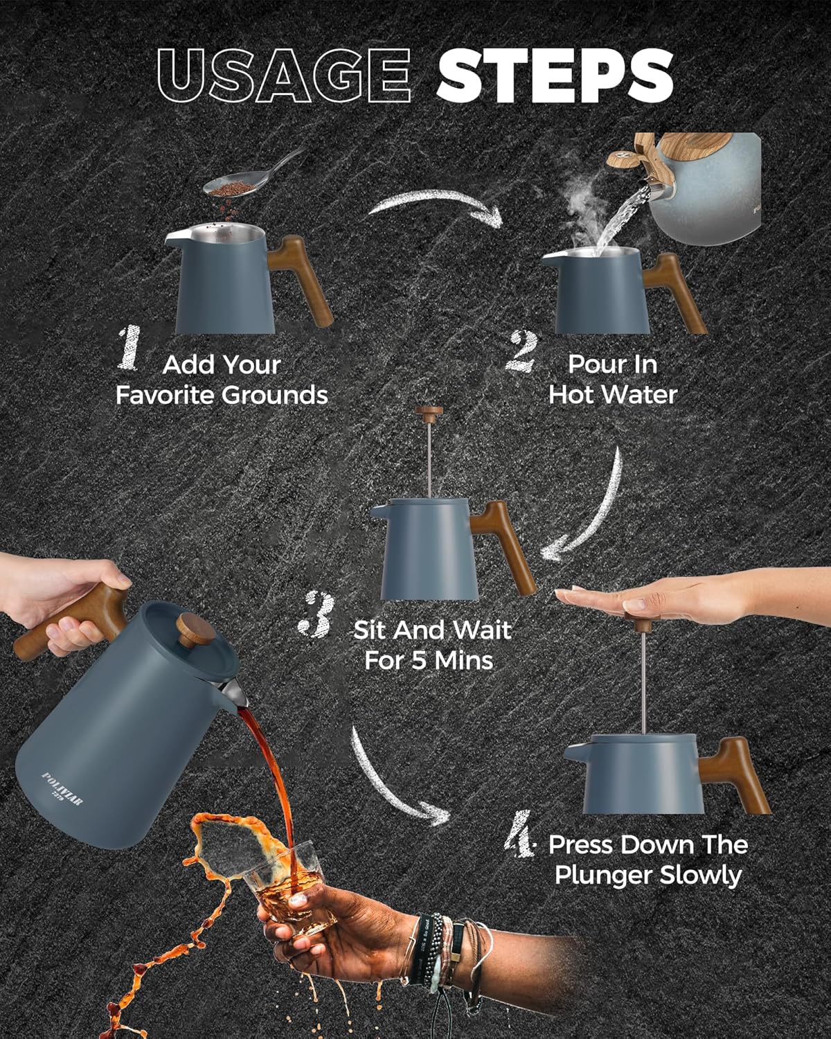 - LOOKING FOR COFFEE PRESS FOR MATCHING UP YOUR KITCHEN? We, the POLIVIAR french press coffee maker will be your smart choice. While the coffee pot is made from food grade stainless steel with stylish long-lasting coating, It is easily to match up your kitchenwares and your kitchen's theme. Also, the ergonomic handle with real wood will maximize the fantastic time of grounds you loved.