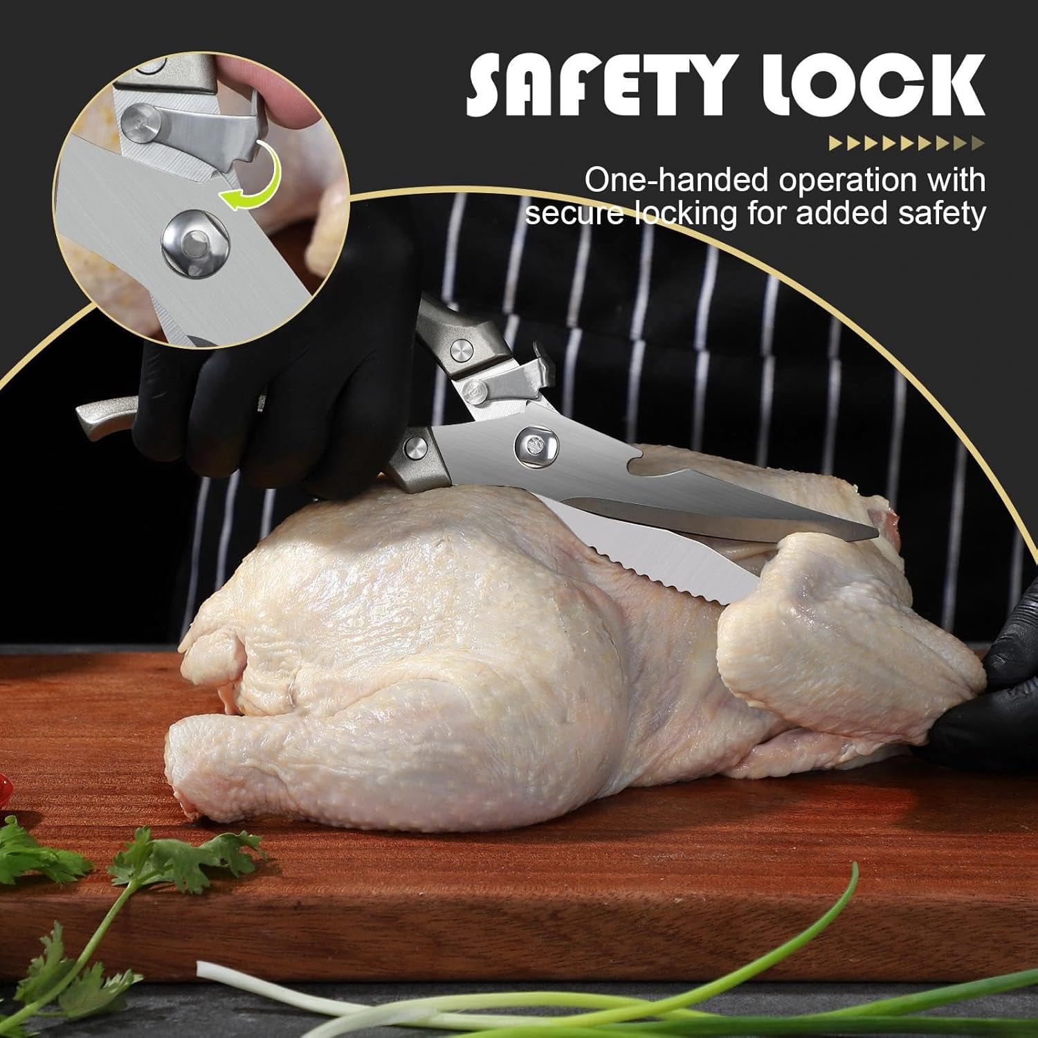 - 【Safe and Efficient】 The poultry scissors heavy duty equipped with a built-in spring mechanism and an easy-to-use safety lock, these poultry shears are engineered for efficiency and safety. The lock can be engaged with one hand, keeping the blades securely closed when not in use, ensuring safe storage.The streamlined handle, palm-fitting design distributes pressure evenly, reducing fatigue during prolonged use.