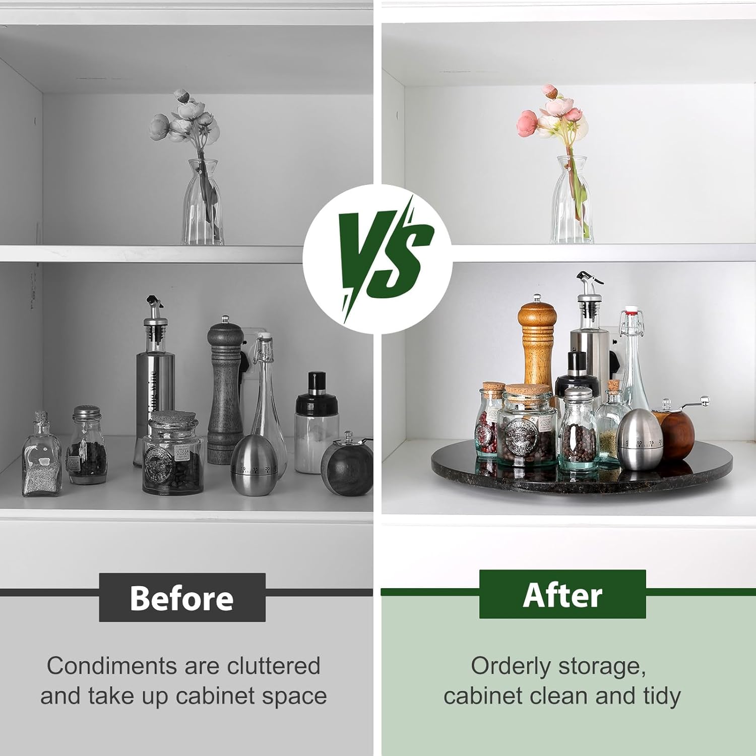- VERSATILE LAZY SUSAN: Perfect spinning storage organizer for the table, kitchen countertop, under the sink, cabinet closet, pantry, refrigerator, bathroom countertop, vanity makeup, office, and more. Its durable construction ensures it can withstand daily use, making it a practical yet elegant solution for home organization.
