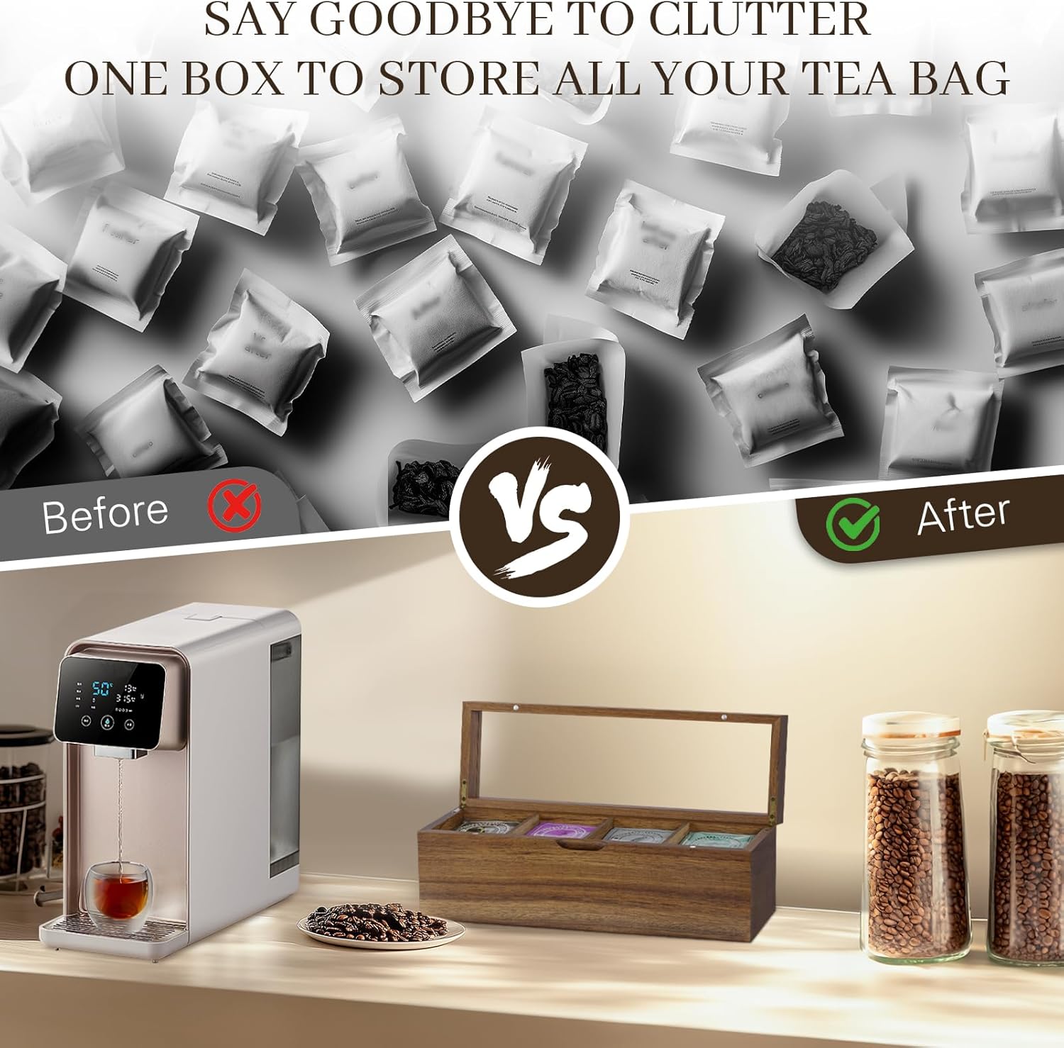 - [Attractive Design]: Our tea caddy for tea bags organizer is loved by tea lovers for its simple aesthetics and practical design. It is a tasteful and practical gift suitable for tea lovers, parents, friends, colleagues and bosses, allowing the fragrance of tea to accompany every beautiful moment.