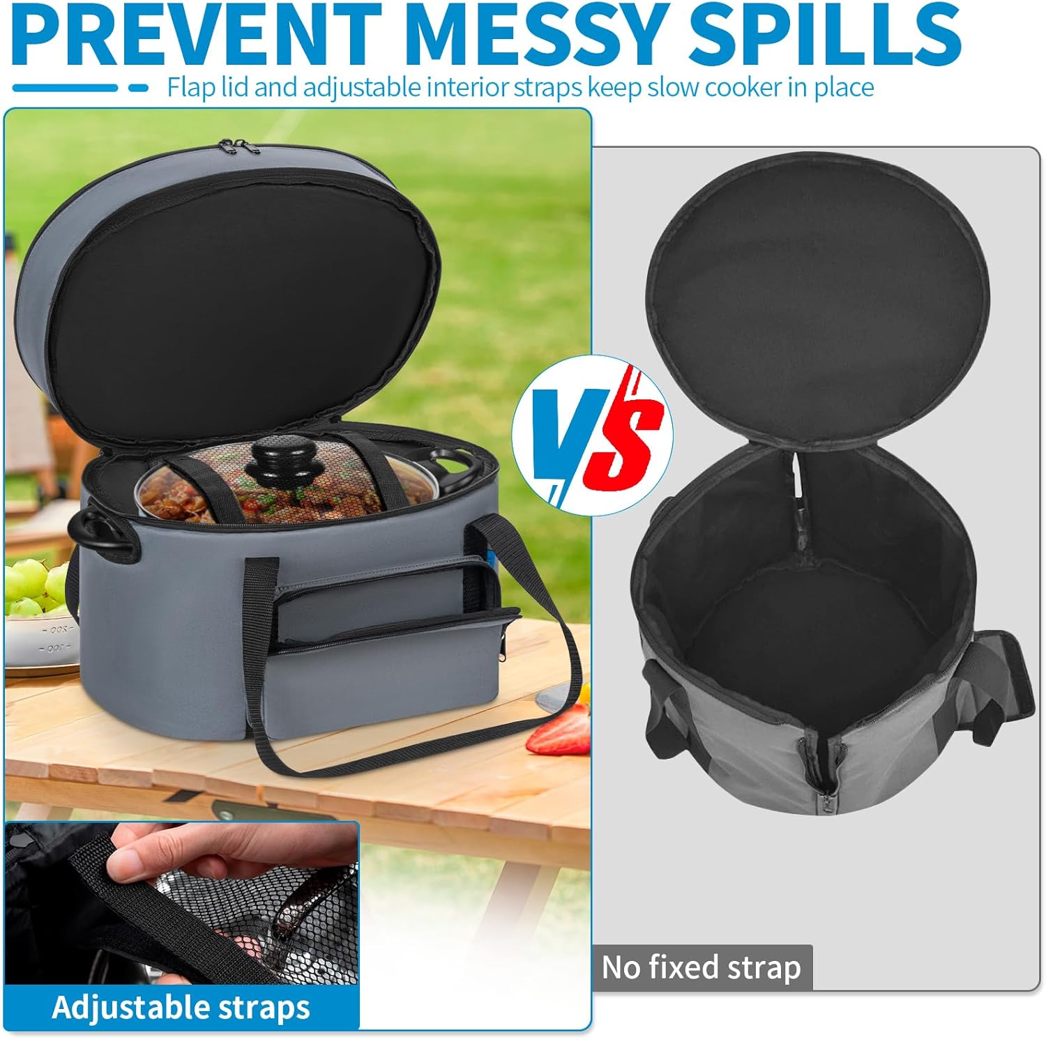 - 【Prevent Food Spills】: The inner mesh is closed with Velcro to secure Your slow cooker in place, allowing you to travel without worrying about it while on the move