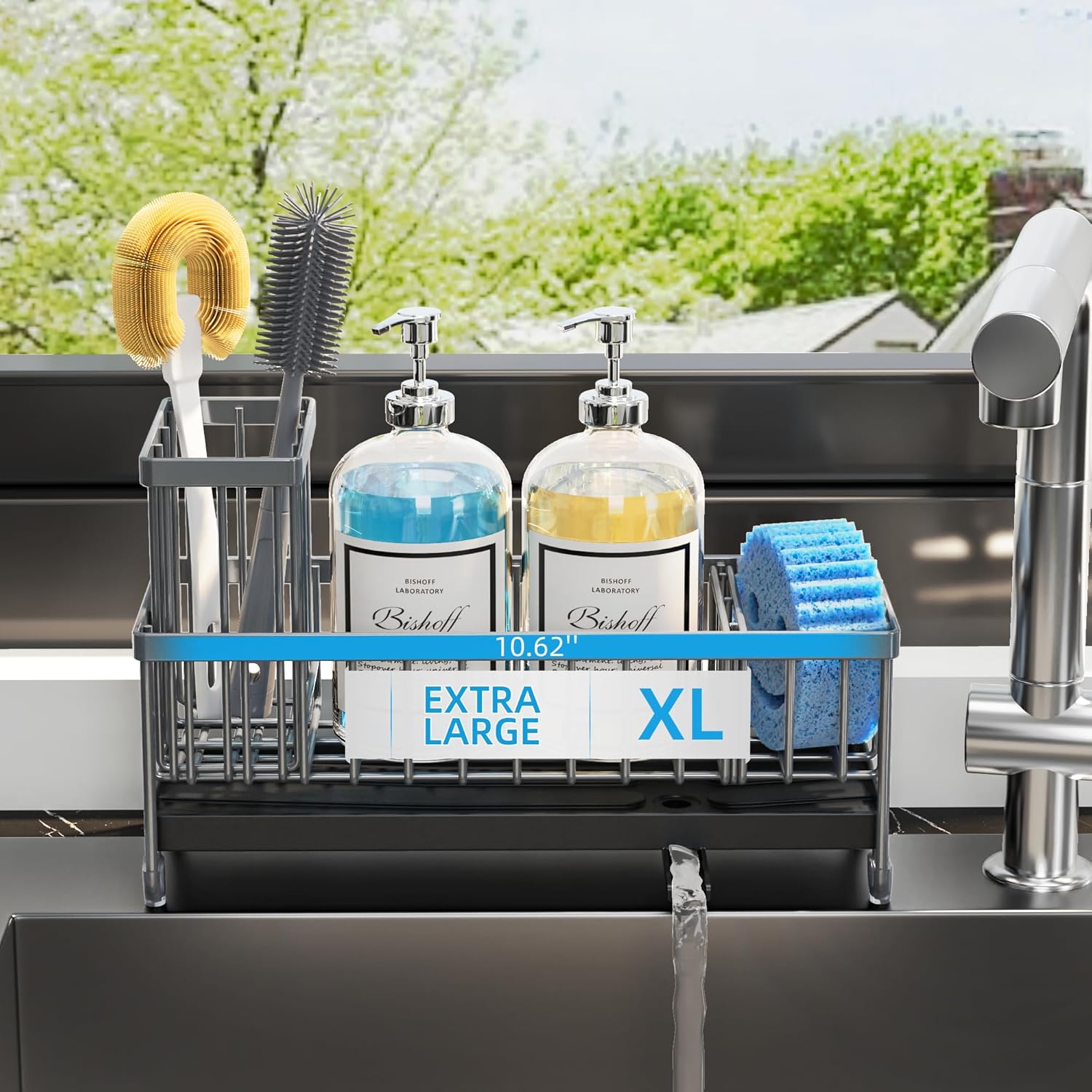 - 【LENGTH UPGRADE LONGER VERSION】Moforoco Lengthen sponge holder has increased the length by 1.37 inches compared to the regular 9.25-inch length on the market, and the total length is 10.62 inches. It means you can accommodate 2 * soap dispenser bottles, 4* brushes, and a sponge, making your storage space easier, accommodating more of your items and saying goodbye to clutter.