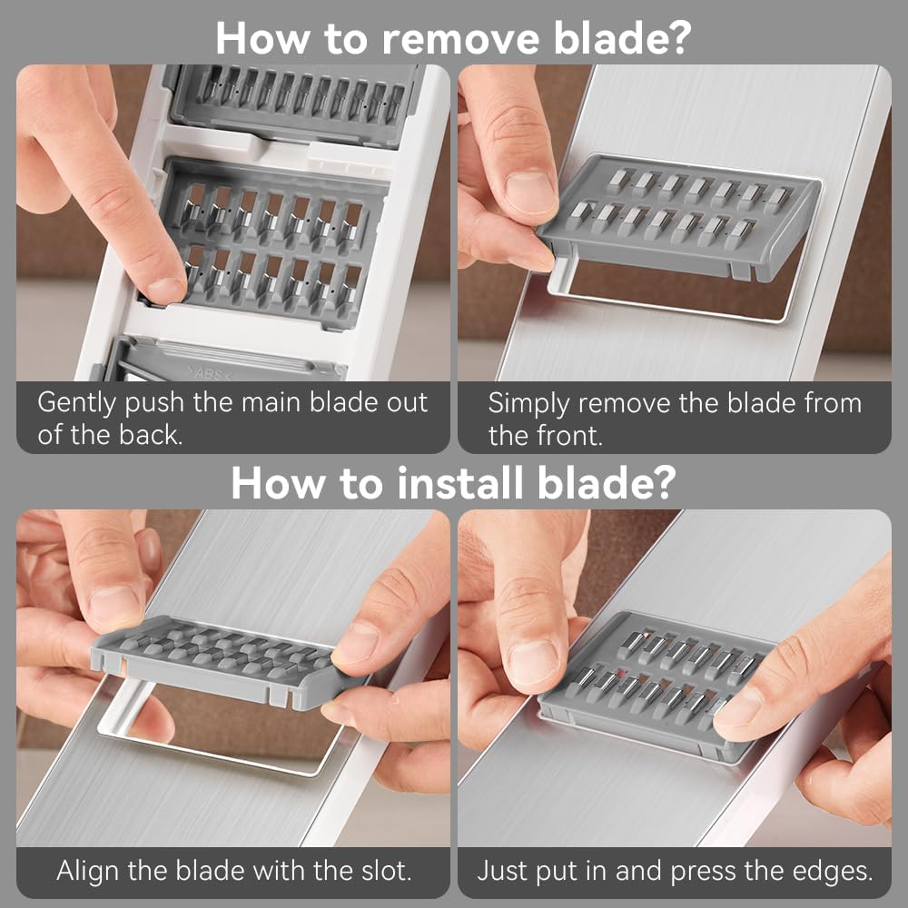 - Effortless Cleaning & Storage β All parts detach in seconds and are simply rinsed off by water. Blades store neatly inside a box and back of the slicer to prevent aaccidents and save space.