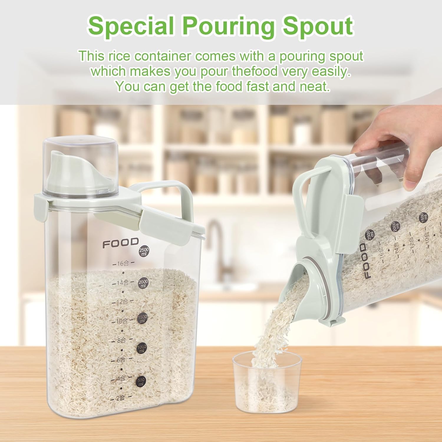 - UPGRADED EASY-POUR LARGE SPOUT: This rice Bin features a large pouring spout to easily dispense your ingredients. Its ergonomic design provides a comfortable grip for easy one-handed pouring.rice storage containers Slim compact and space-saving