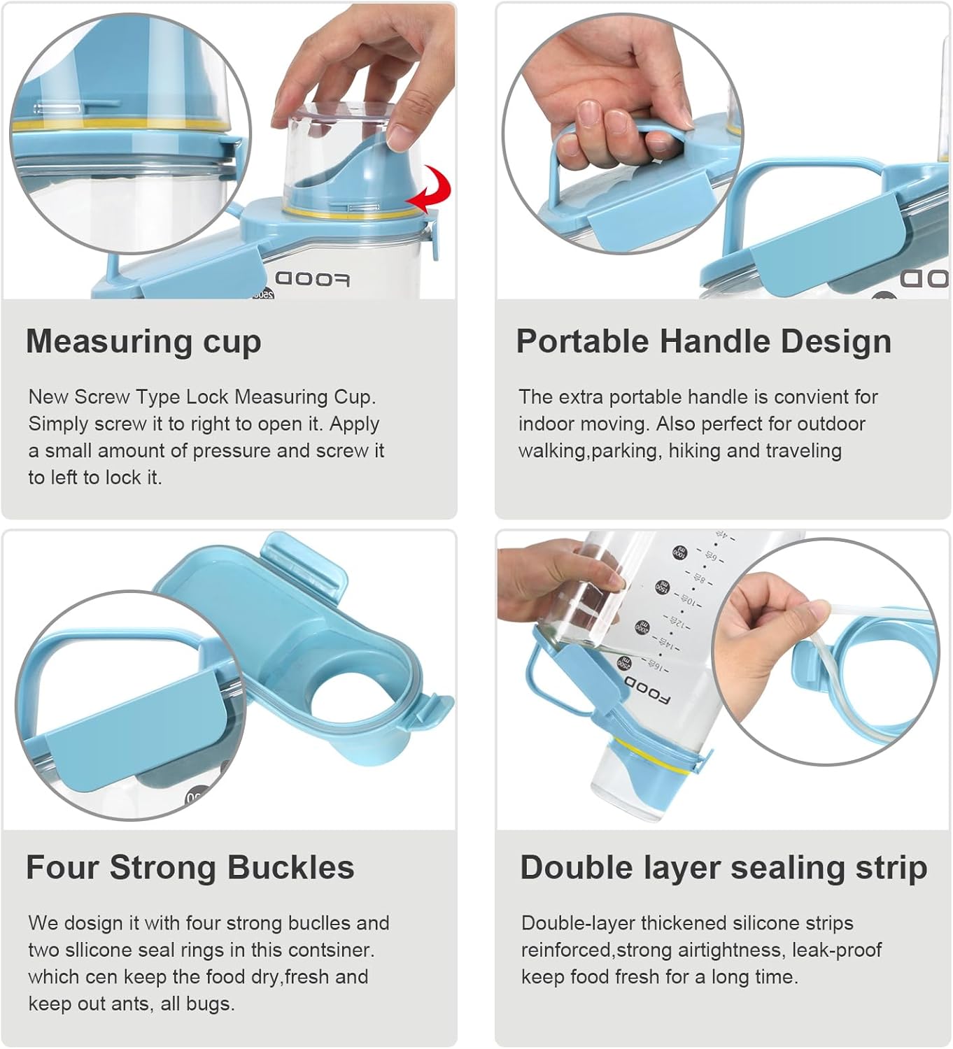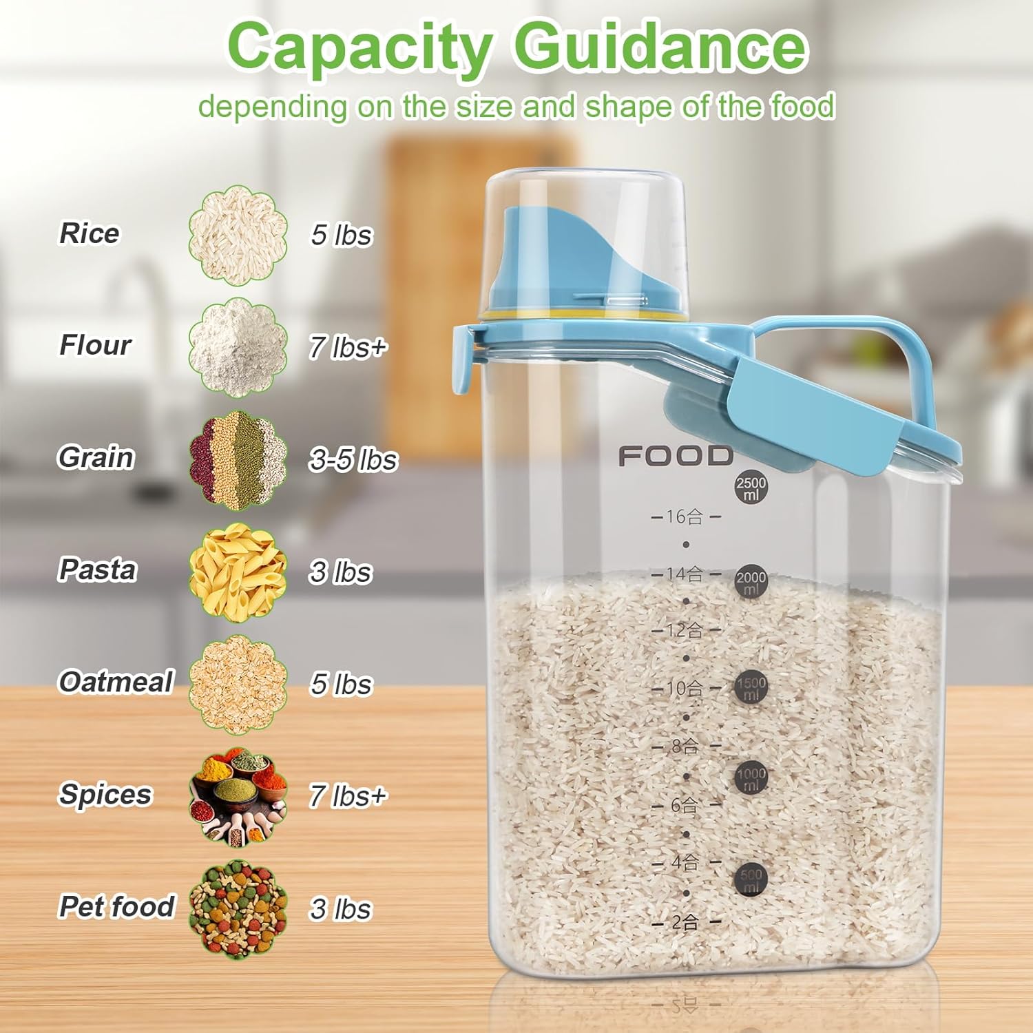 - LARGE CAPACITY:Portable rice airtight storage container capacity of 5 liters, which is very suitable for beans,Cereal,flour, sugar, oatmeal, coffee, rice, nuts, snacks, dog food, cat food, pet food, etc. (Note: The storage capacity of the container varies depending on the size of the food. Pet food can hold 5 pounds, and rice food can hold 5-10 pounds)