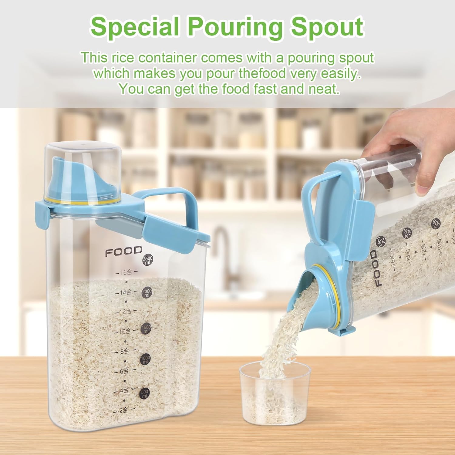 - UPGRADED EASY-POUR LARGE SPOUT: This rice Bin features a large pouring spout to easily dispense your ingredients. Its ergonomic design provides a comfortable grip for easy one-handed pouring.rice storage containers Slim compact and space-saving