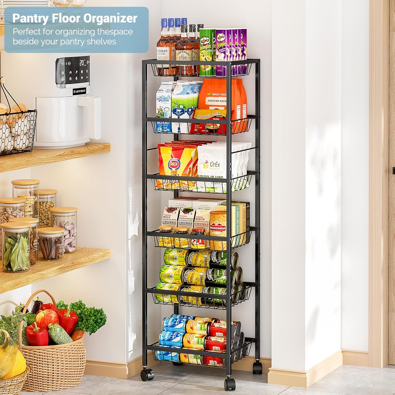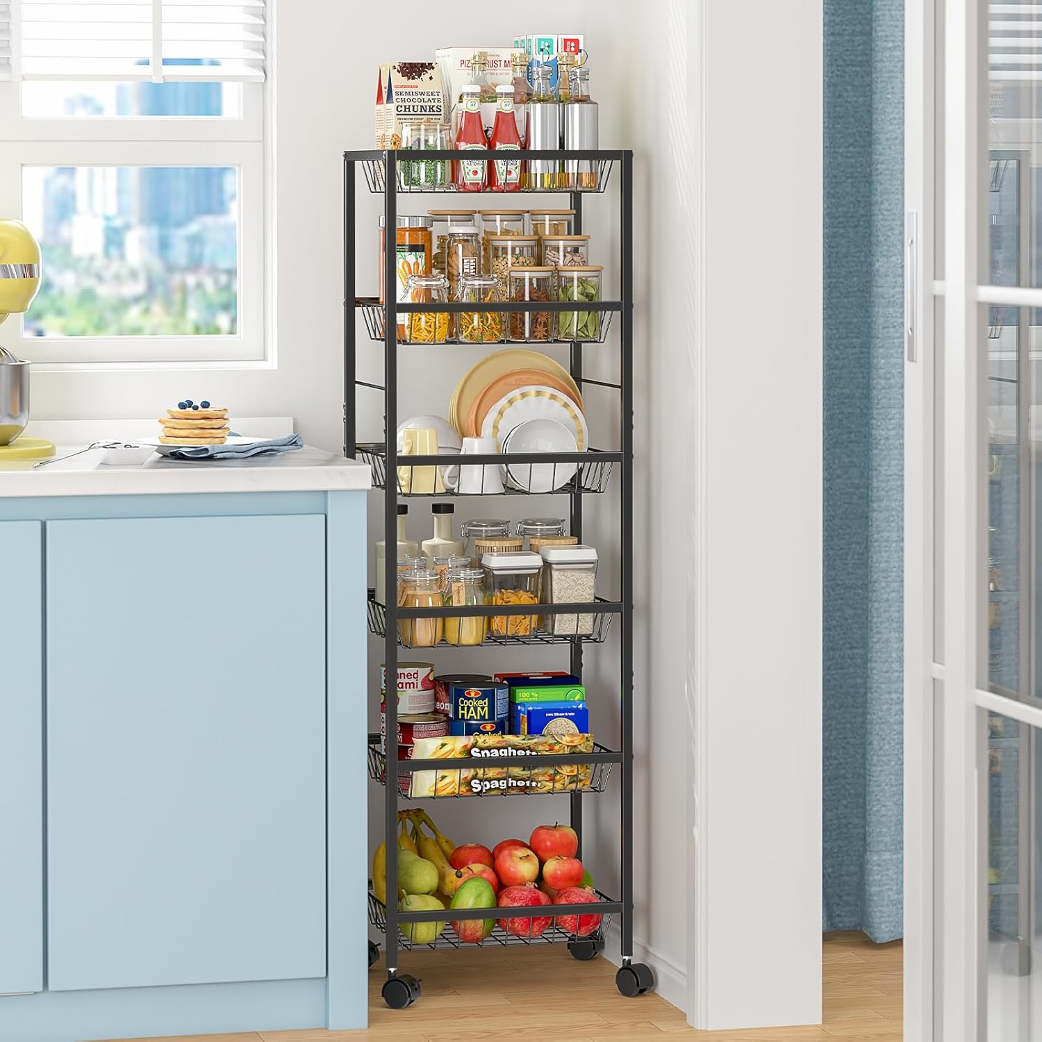 Fruit Vegetable Basket for Kitchen, 6 Tier Fruit and Vegetable Storage Cart, Metal Wire Storage Baskets with Wheels, Small Rolling Cart Organizer Rack for Pantry, Living Room, Bathroom