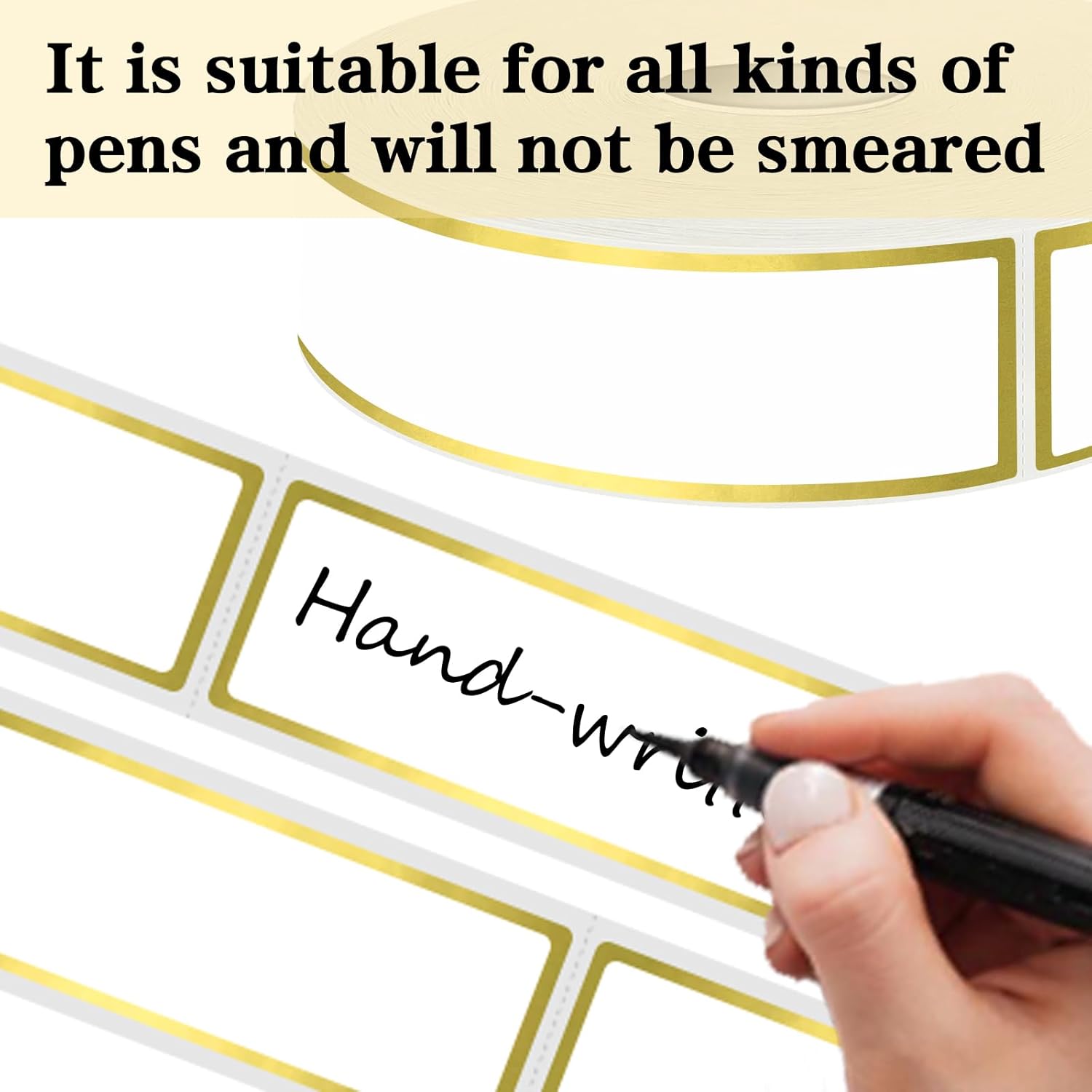 - Packaging: 500 pcs on a roll,Each measures 1” X 3”,Blank and white with gold border