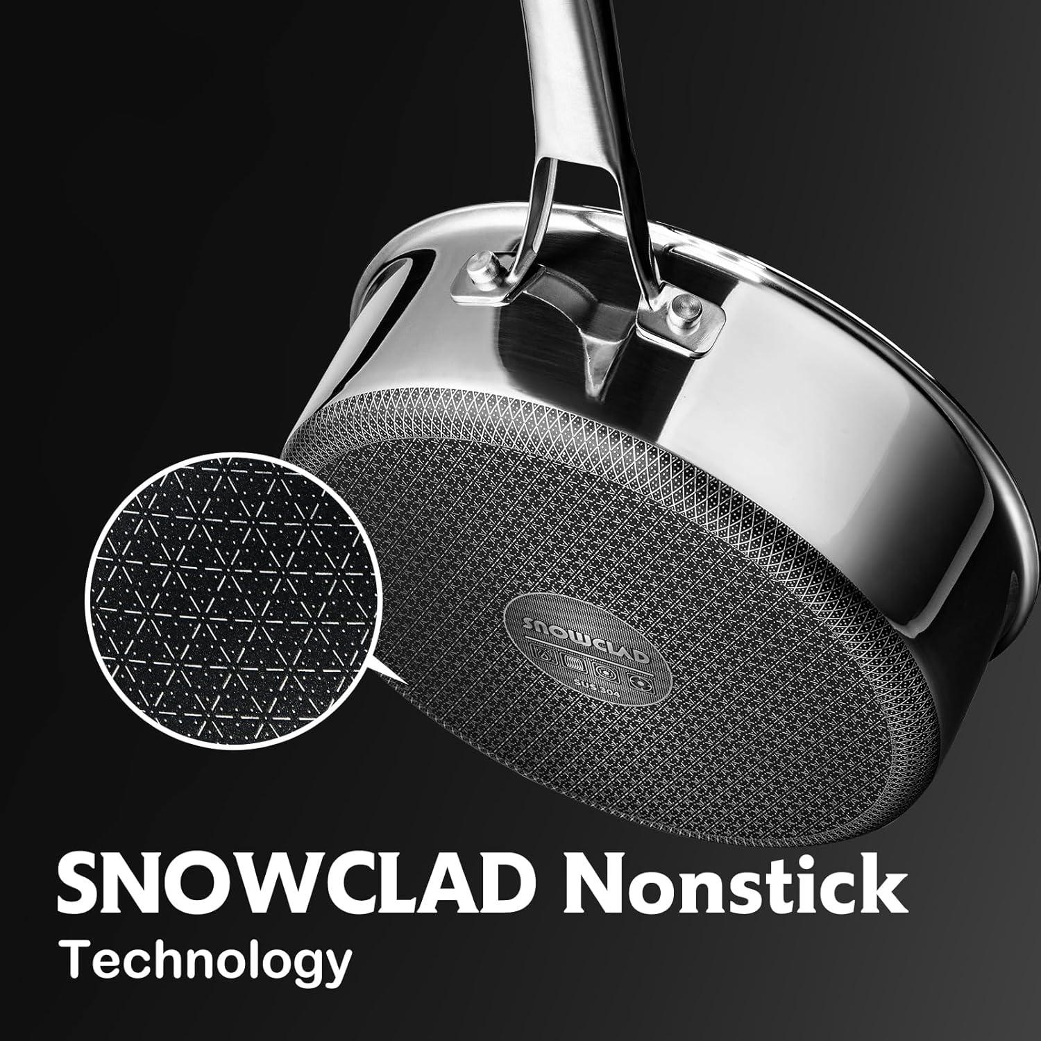 - 【SNOWFLAKE TECHNOLOGY】Our design is created through a laser etching process to provide both stainless steel and non stick surface. This dual surface allows to cook with less oil, grease, and butter.Our clad surface is 50% more than usual Hex surface non stick frying pans.