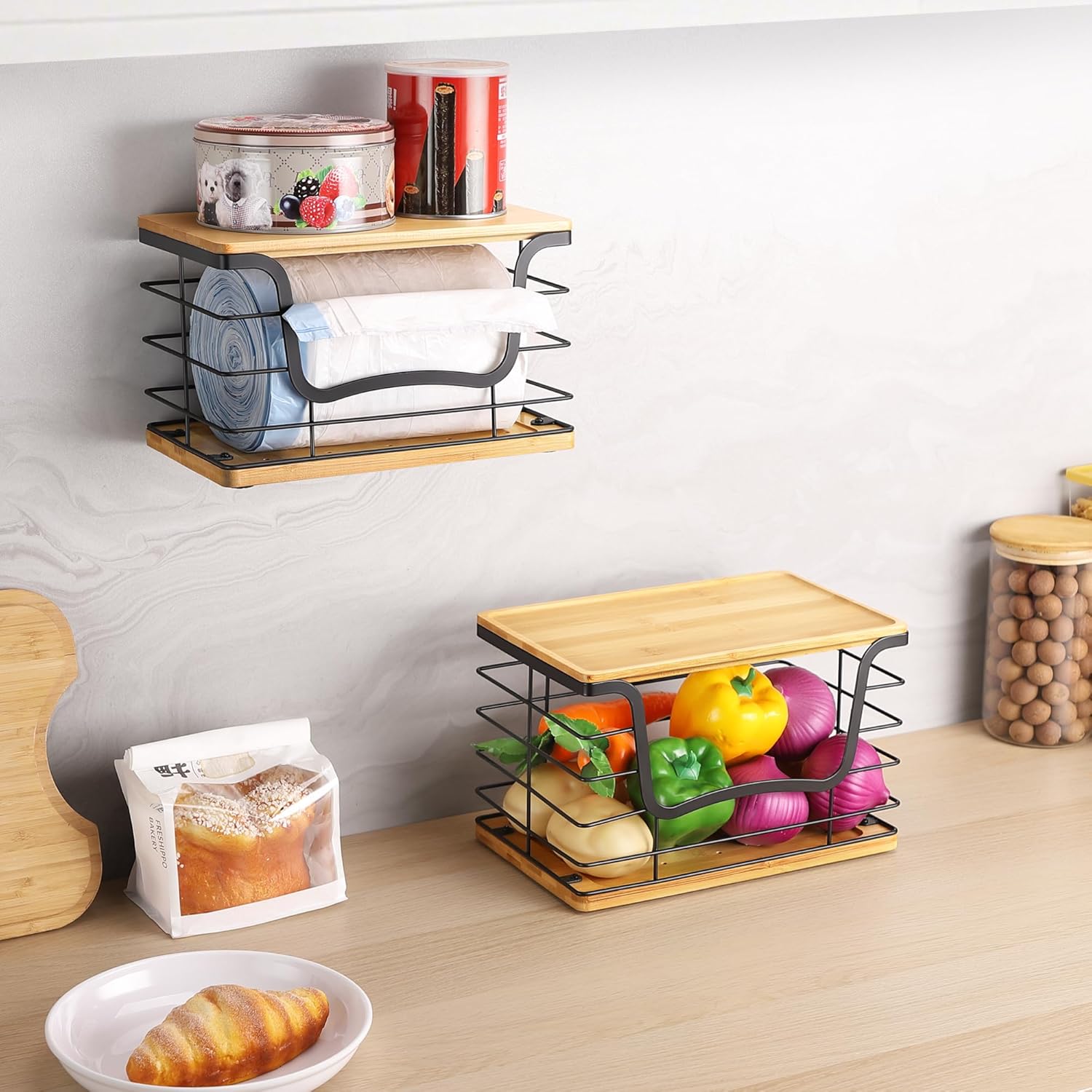 Trash Bag Dispenser Holder for Kitchen 2 Pack Laundry Room Trash Bag Holder Wall Mount Garbage Bag Dispenser Stainless Steel Roll Holder with Bamboo Top for Countertop, Under Sink