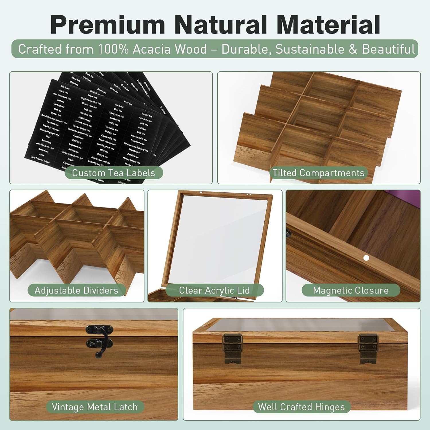 - 🍵Clear Acrylic Lid & Custom Tea Labels:The clear acrylic top lid provides a full view of your tea collection while keeping contents fresh and dust-free. Included are customized tea name labels (Green Tea, Black tea,etc.), making it easy to organize and identify your favorite blends at a glance