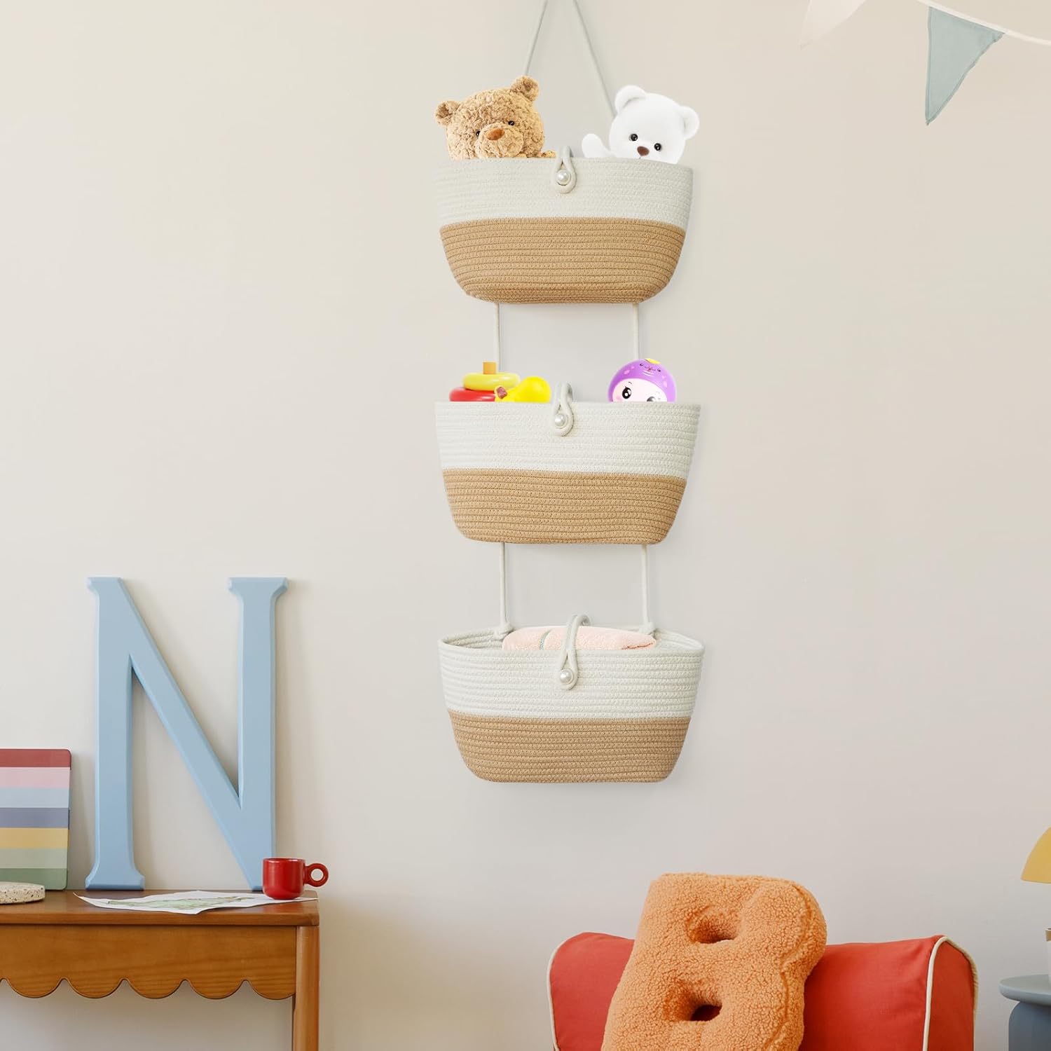 - Widely Usage: This decorative hanging baskets can be hung in the dining room, nursery, playroom, entryway, bedroom, bathroom, kitchen or door. Perfect for organizing a variety of items, such as baby shoes, glasses, toiletries, chargers, towels, diapers, and more. It's a versatile wall decor accent for any space.