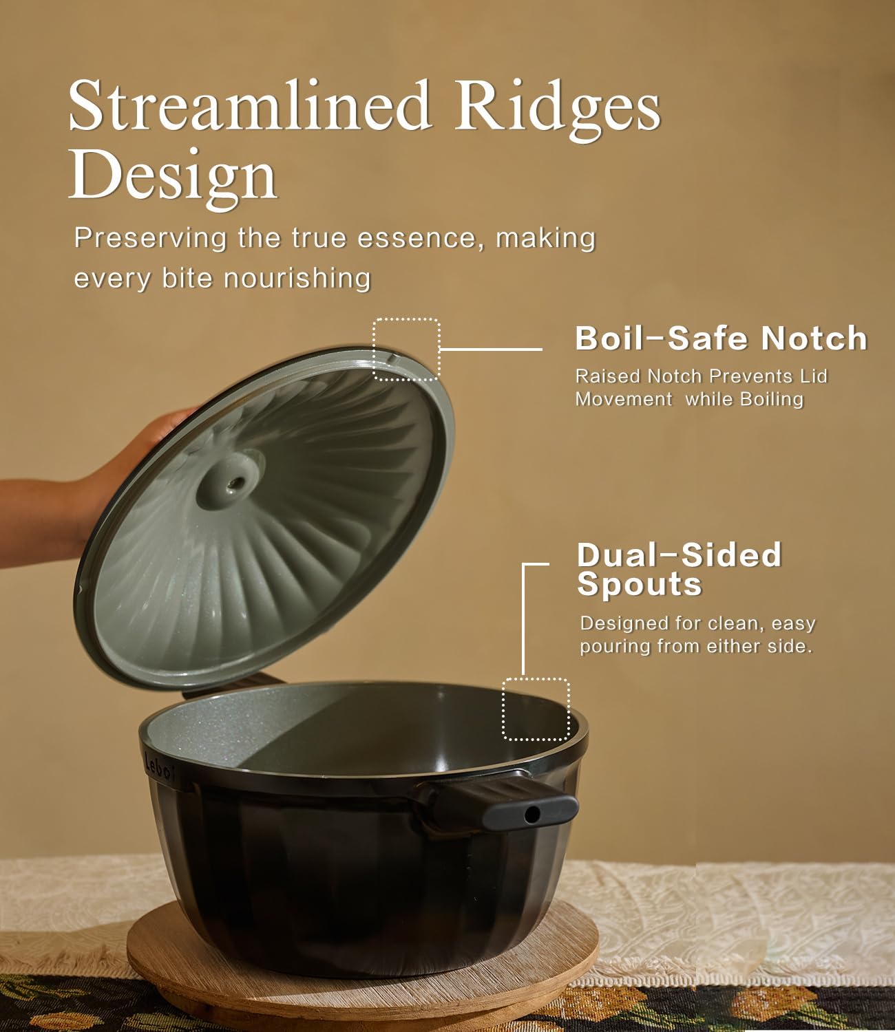 - Thoughtful Design for Everyday Ease: From streamlined ridges that lock in flavor to a raised notch that keeps the lid steady while boiling—every design choice serves a purpose. Dual-sided spouts make pouring easy from either side, and the stay-cool handle with heat cap adds comfort and safety.