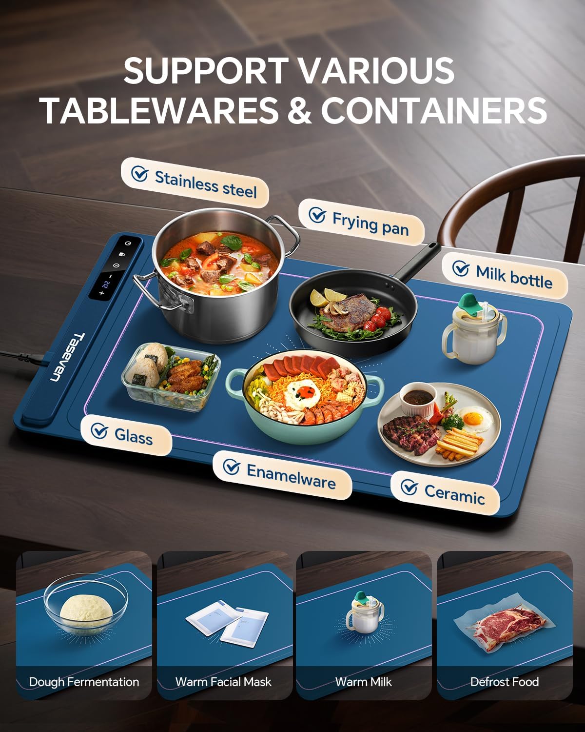 - Widely Compatible and Various Occasion:Our food warming mat is suitable for all types of dinnerware,including metal, ceramic,glass and enamel,to meet your daily needs.Our food heater is also a useful tool,with mask heating,dough fermentation and defrosting all easy to operate.Suitable for home use in all seasons!