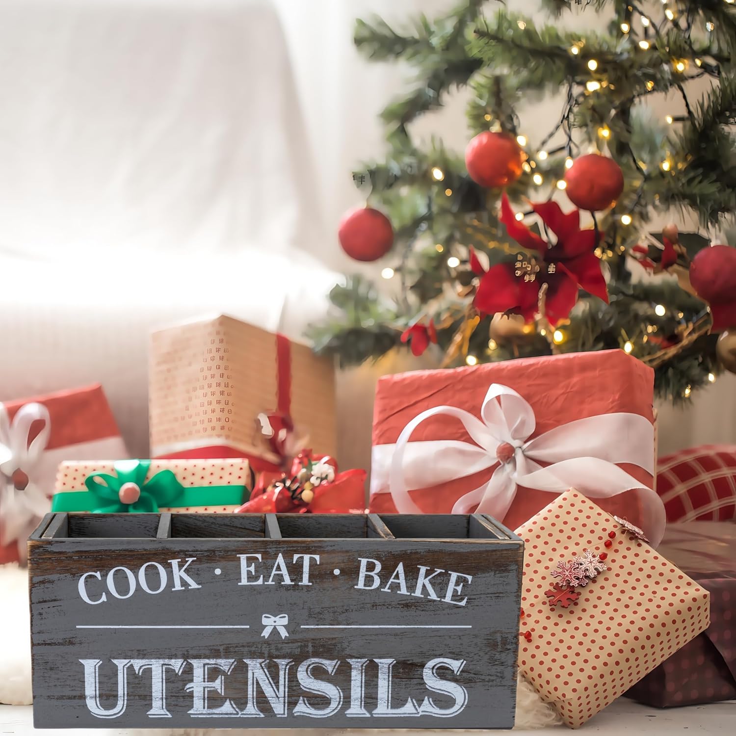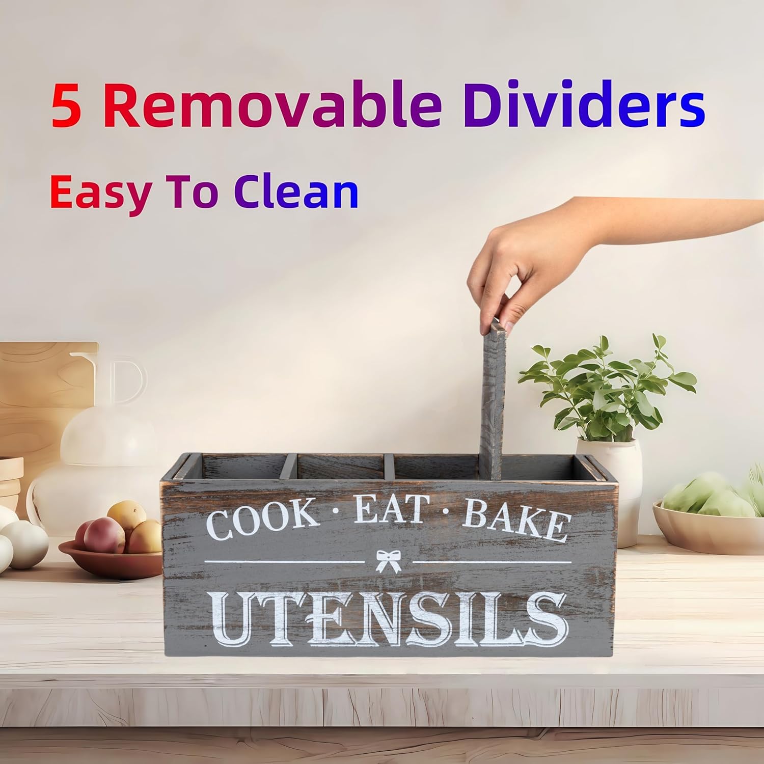 Utensil Holder,Extra Large Wooden Utensil Holder For Kitchen Counter,Cooking Spatula Organizer,Big Storage Caddy With 4 Compartments Flatware Spoon Tool Cutlery(Grey)