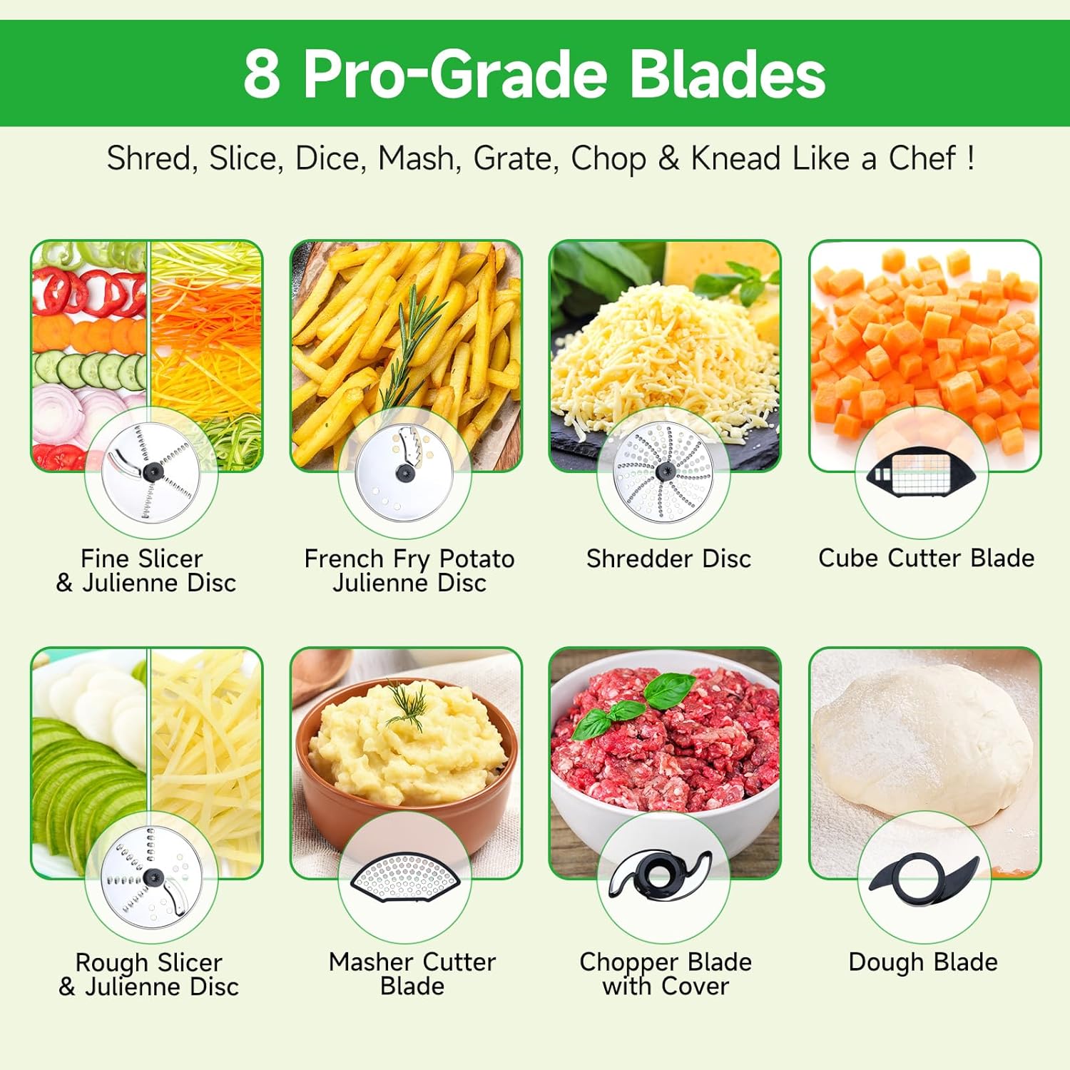 - ăComplete Accessory Kit for Every Kitchen TaskăThis Homtone food processor includes 8 professional blades & discs: 4 Stainless Steel Discs â French fry cutter, 2-in-1 rough/fine slicer & shredder; 2 S-Blades â Chopping blade + Kneading Blade; Cube Cutter & Masher â Perfect for salsas or baby food, Whisk Attachment â Fluffy whipped cream or meringues in seconds.