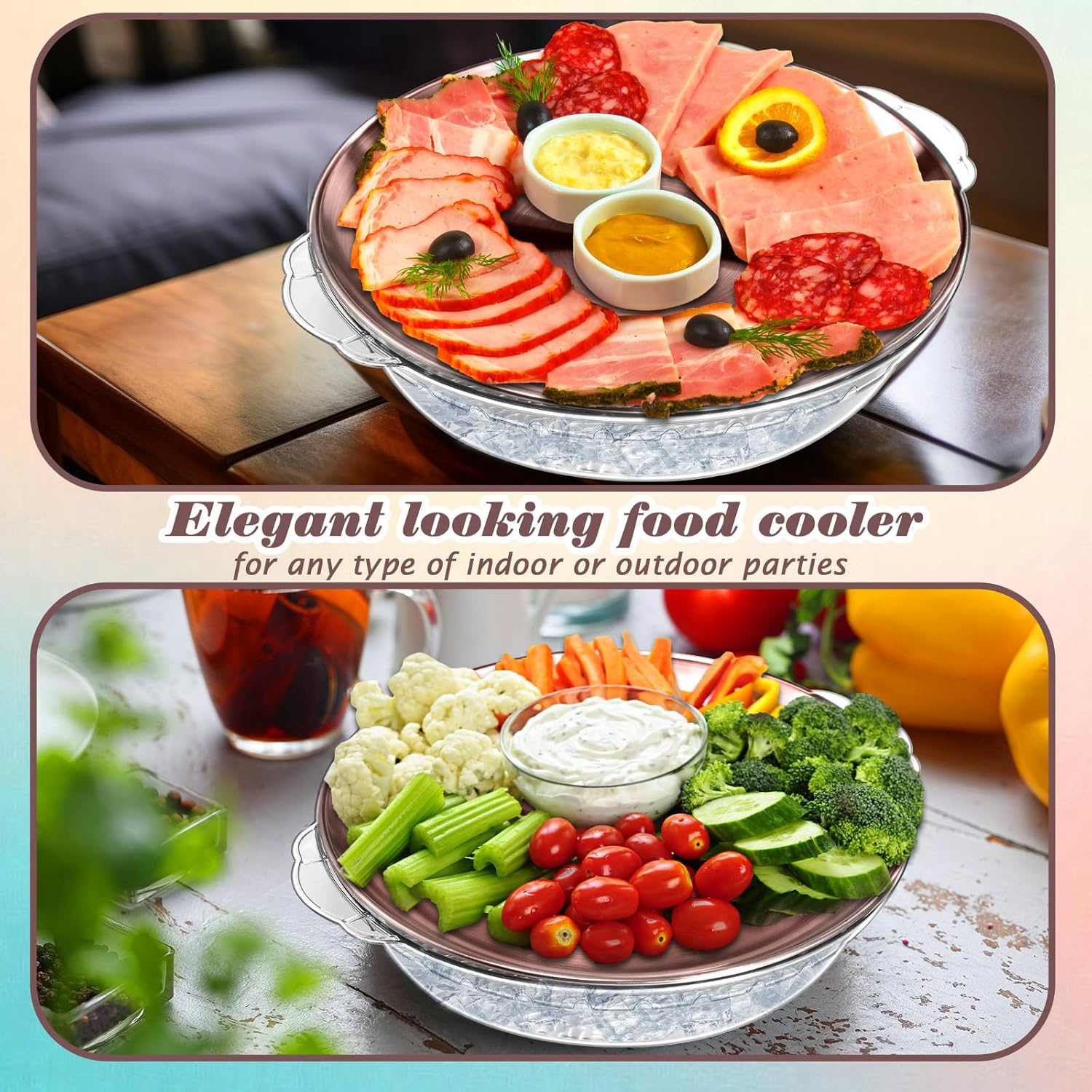 - Versatile Usage: this veggie trays for serving for party is suitable for family gatherings, company events, cookout, BBQ, picnic, camping; Elegant looking food cooler for any type of indoor or outdoor parties; Ideal for cooling food outside