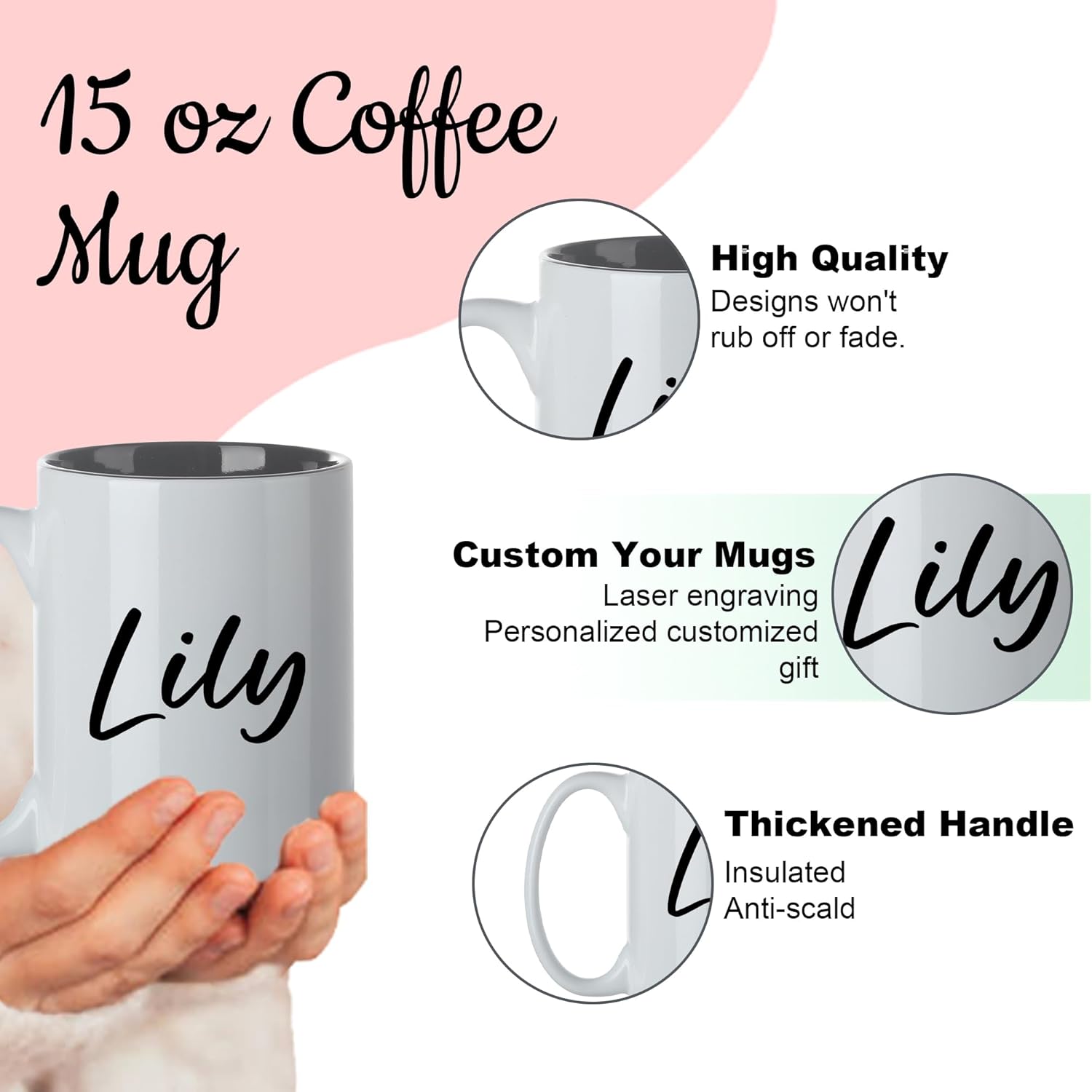 - Personalized Mugs With Names: Our personalized engraved mugs can be personalized with a custom name, initials and a heartfelt message. This coffee mug is made of ceramic and has a sturdy handle to fit any size hand.