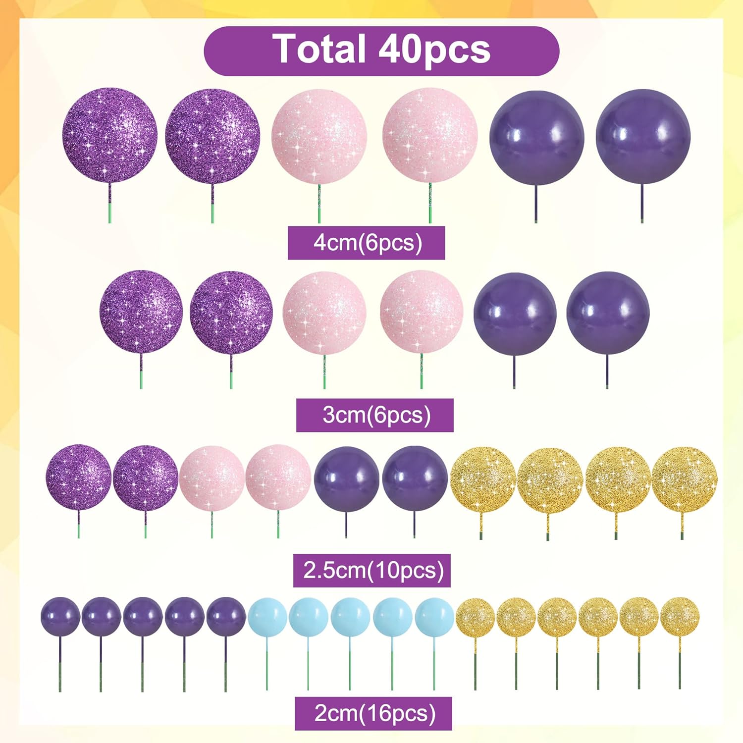 BEISHIDA 40 Pcs Foam Ball Cake Toppers with Sticks Mini Cake Decorations for Birthdays, Weddings, Baby Showers, DIY Baking Supplies, Anniversary Party (Purple, Rose, Gold, Blue)