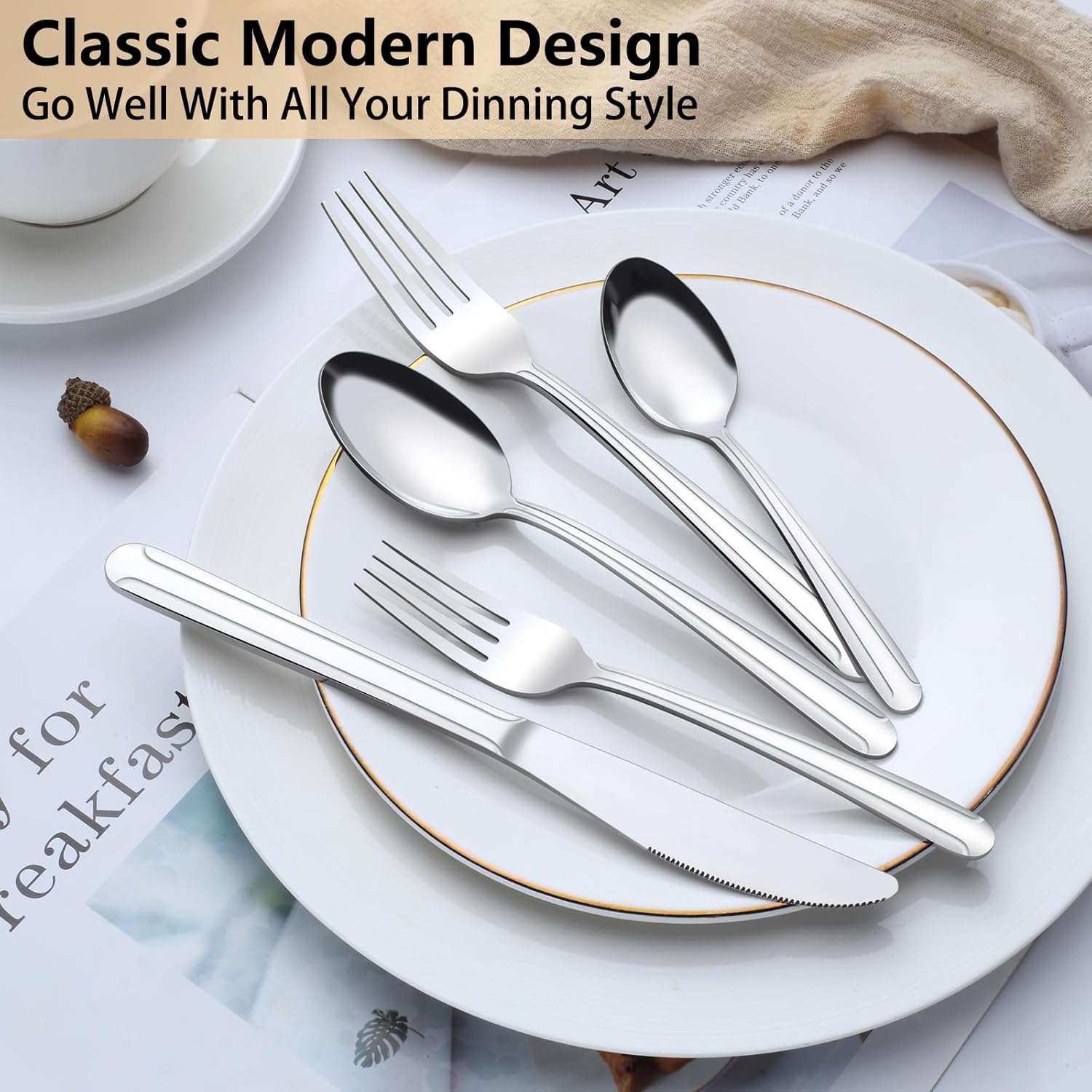 - ăExquisite Workmanship and Mirror PolishedăOur silverware set has highly polished makes the flatware set looks shiny and smooth edges that will not hurt your mouth while you using it. And our fork knife and spoon set design are simple, modern and elegant, with graceful line, perfectly shaped and sized, which have a classic design allows for mix and match with your existing flatware to elevate everyday meals into a fine dining experience