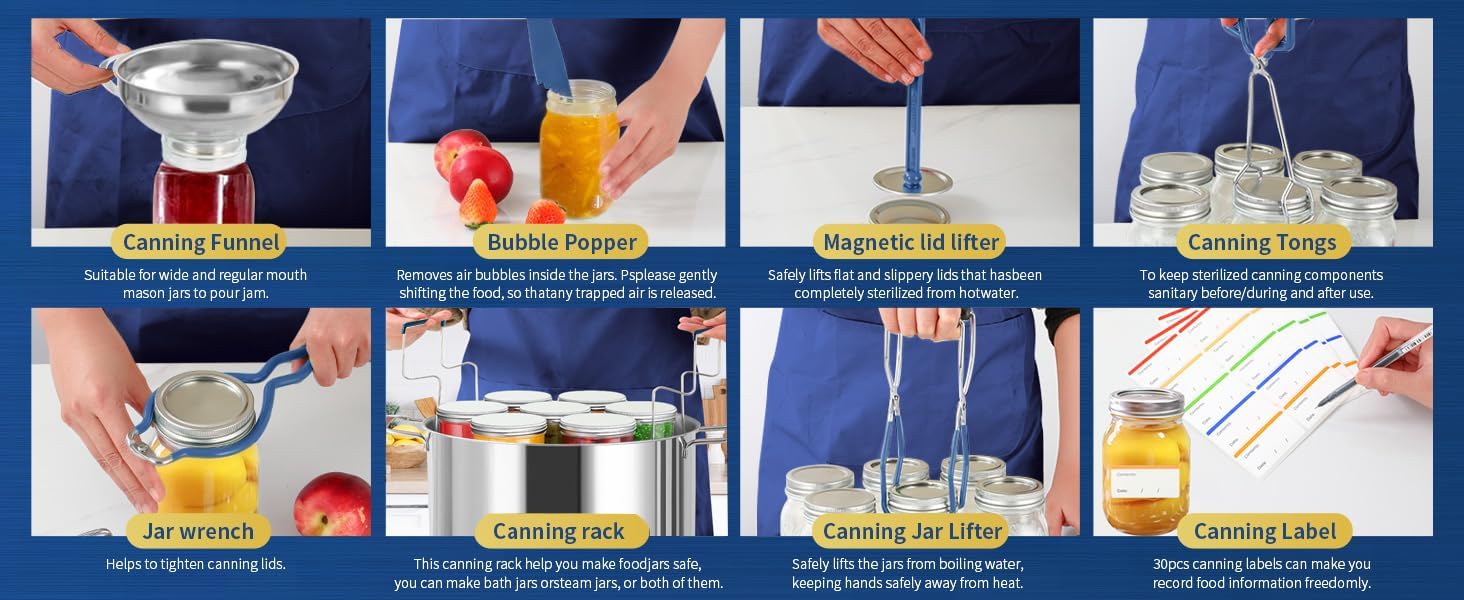 - 【All-in-one Canning Kit for Beginners】: We have a stainless steel steamer rack,a pair of silicone oven gloves, a stainless steel canning funnel, a canning tongs, a jar wrench, a mason jar lifter, a bubble popper, a magnetic lid lifter for canning, 5-in-1 measuring spoon, a stainless steel ladle and canning labels. The perfect canning starter kit for beginners is a good helper for you to make various cans.(Mason jars not included)