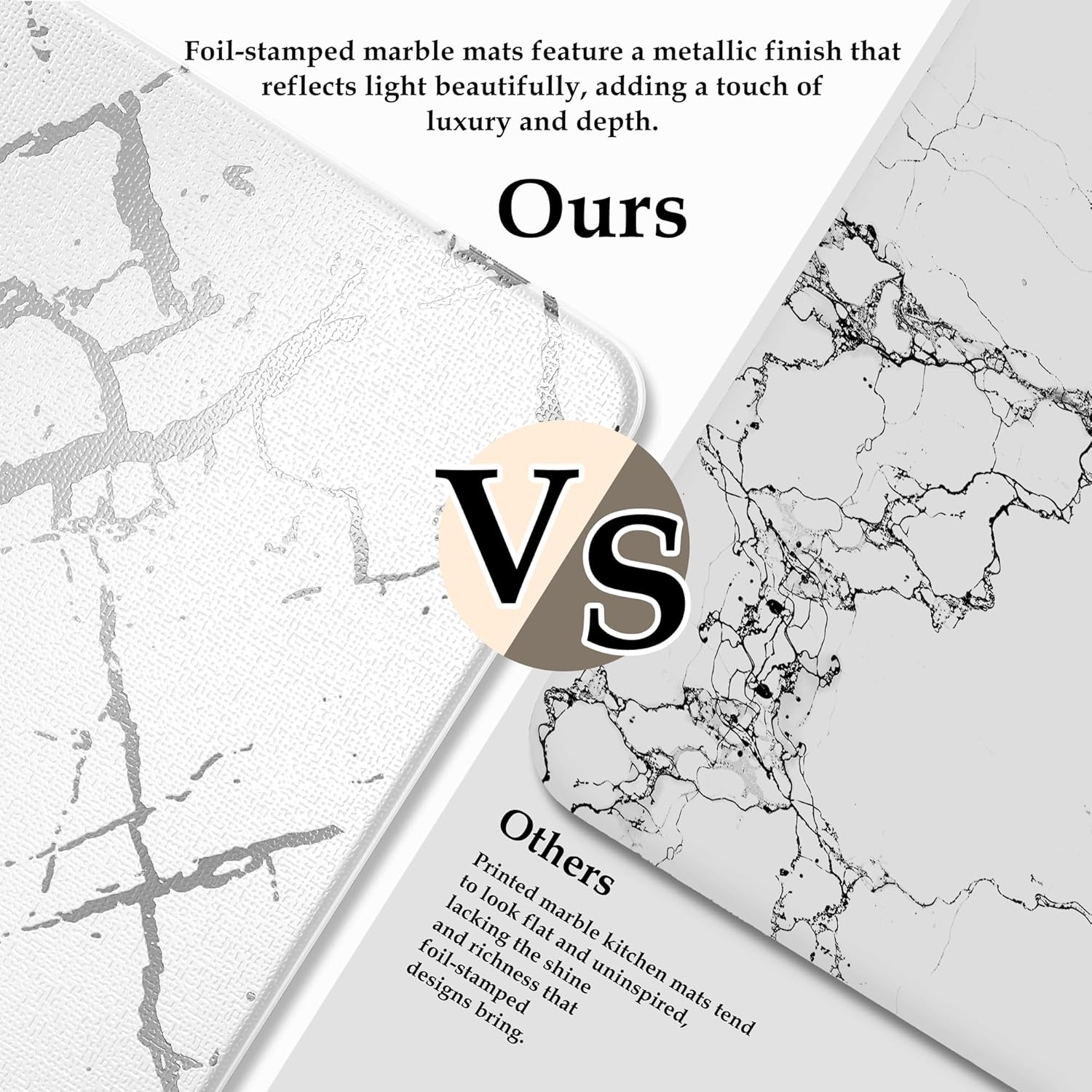 Silver Foil Stamped Marble Kitchen Mats for Floor 2PCS Cushioned Anti Fatigue Non Slip Waterproof Comfort Leather Kitchen Rugs 2/5 Inch PVC Kitchen Mats for Sink, Laundry, 17.3"x28"+17.3"x47",White