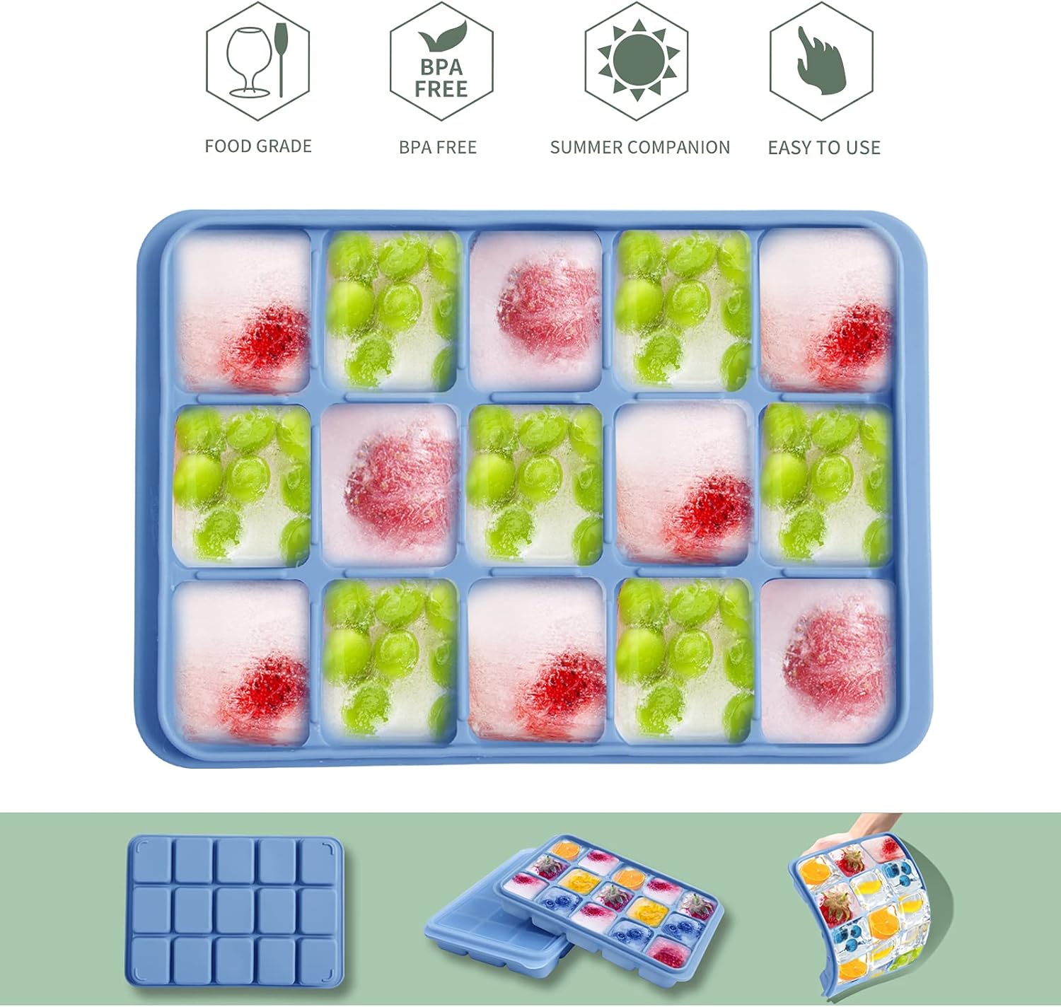 - Versatile & Convenient: Each silicone ice cube tray with lid produces 15 perfectly sized cubes, totaling 30 cubes with the set. Ideal for freezing water, cocktails, whiskey, brandy, chocolates, candies, baby food, and much more.