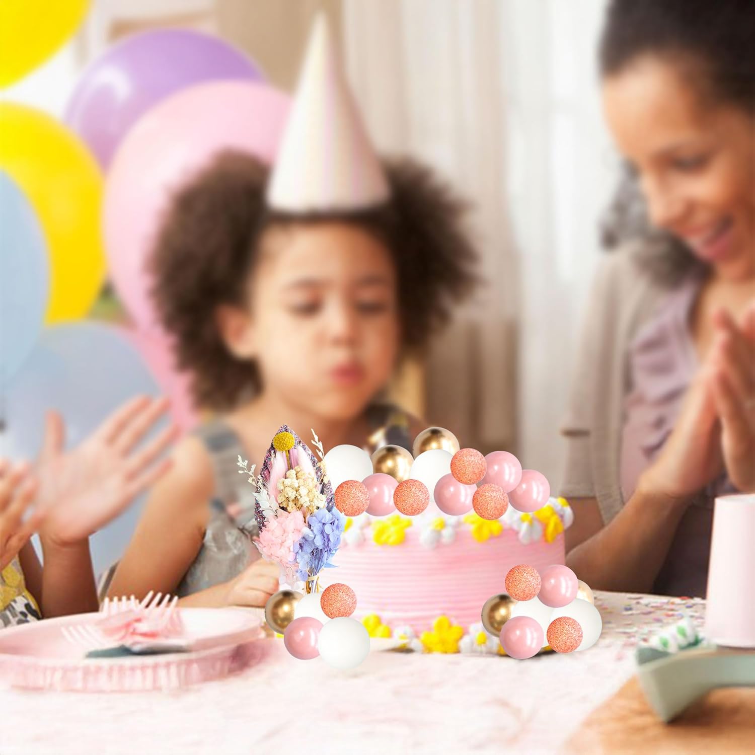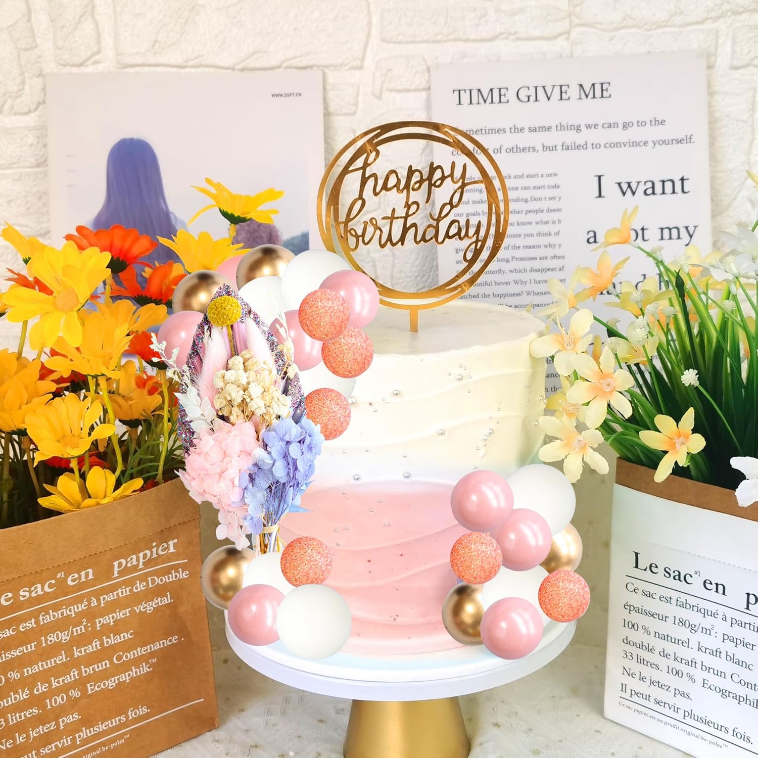 Gyufise 21 Pack Flower Boho Cake Topper Ball Cake Decorations Palm Leaves Plants Cake Decor for Girl Bohemian Princess Theme Wedding Baby Shower Birthday Party Supplies Pink