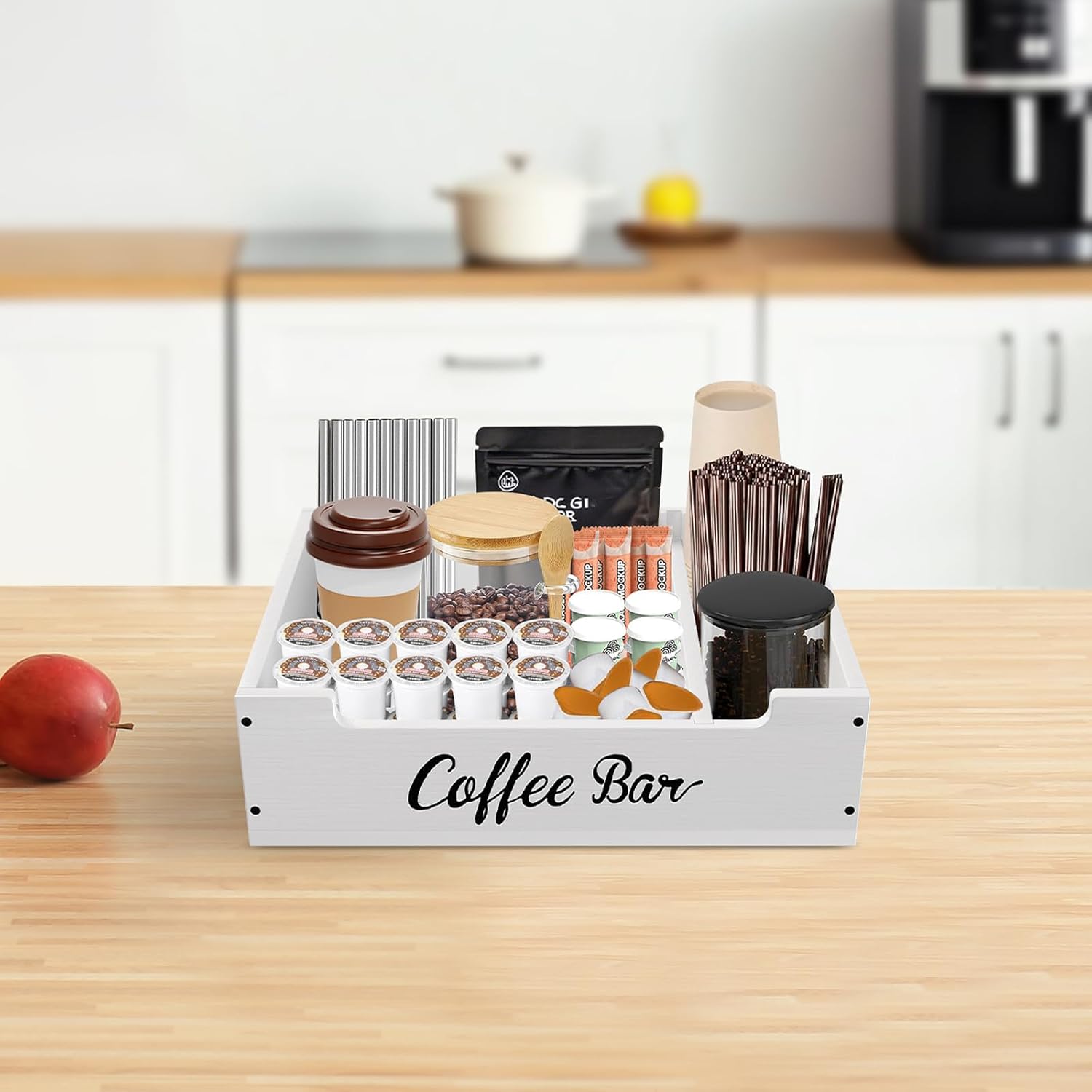 Coffee Pod Bar Station Wooden 14" X 10" X 4" Organizer Box for Countertop, Counter Top Tea Espresso Cup Wood Storage Box, White