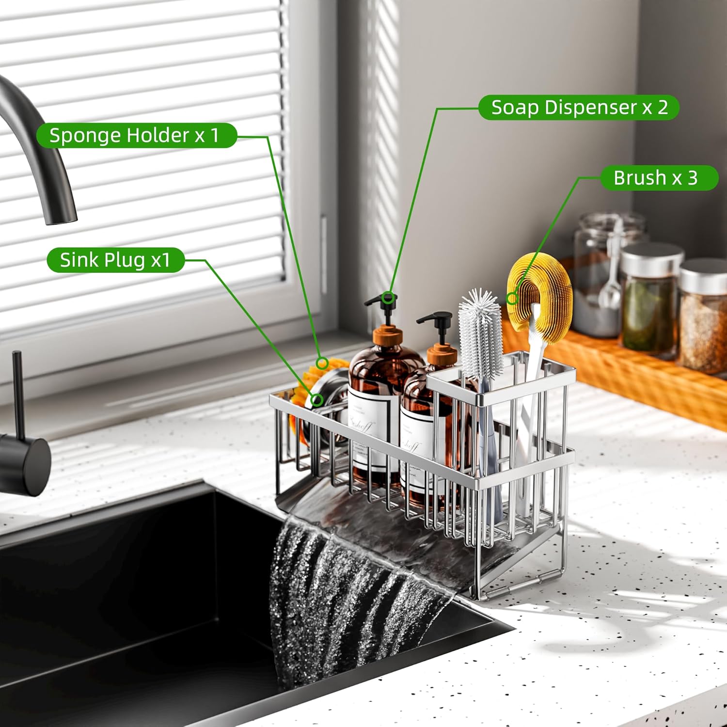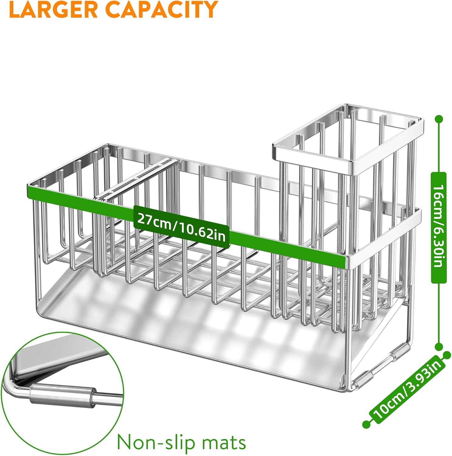 Cisily Extra Large Silver Kitchen Sink Caddy Organzier with High Brush Holder, Sponge Holder for Sink, 304 Rustproof Stainless, Kitchen Countertop Soap Dispenser Organizer For Decor and Accessories