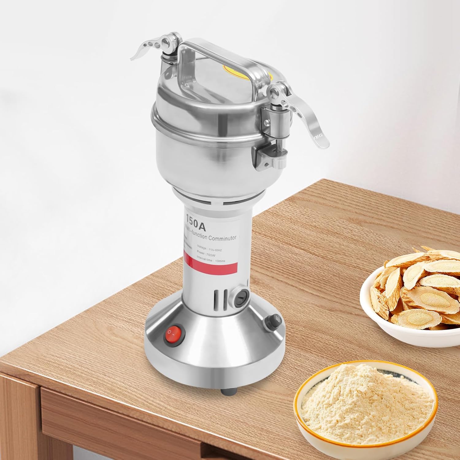 - 🍕【Grain Grinder Parameters】Capacity: 150g/0.33lbs, Material: 304 stainless steel and iron, Voltage: 110V, Rotating speed: 28000r/min, Power: 850W, Grinding degree: 50-300 mesh, Working time: 1-5 min, Interval time: 10 min