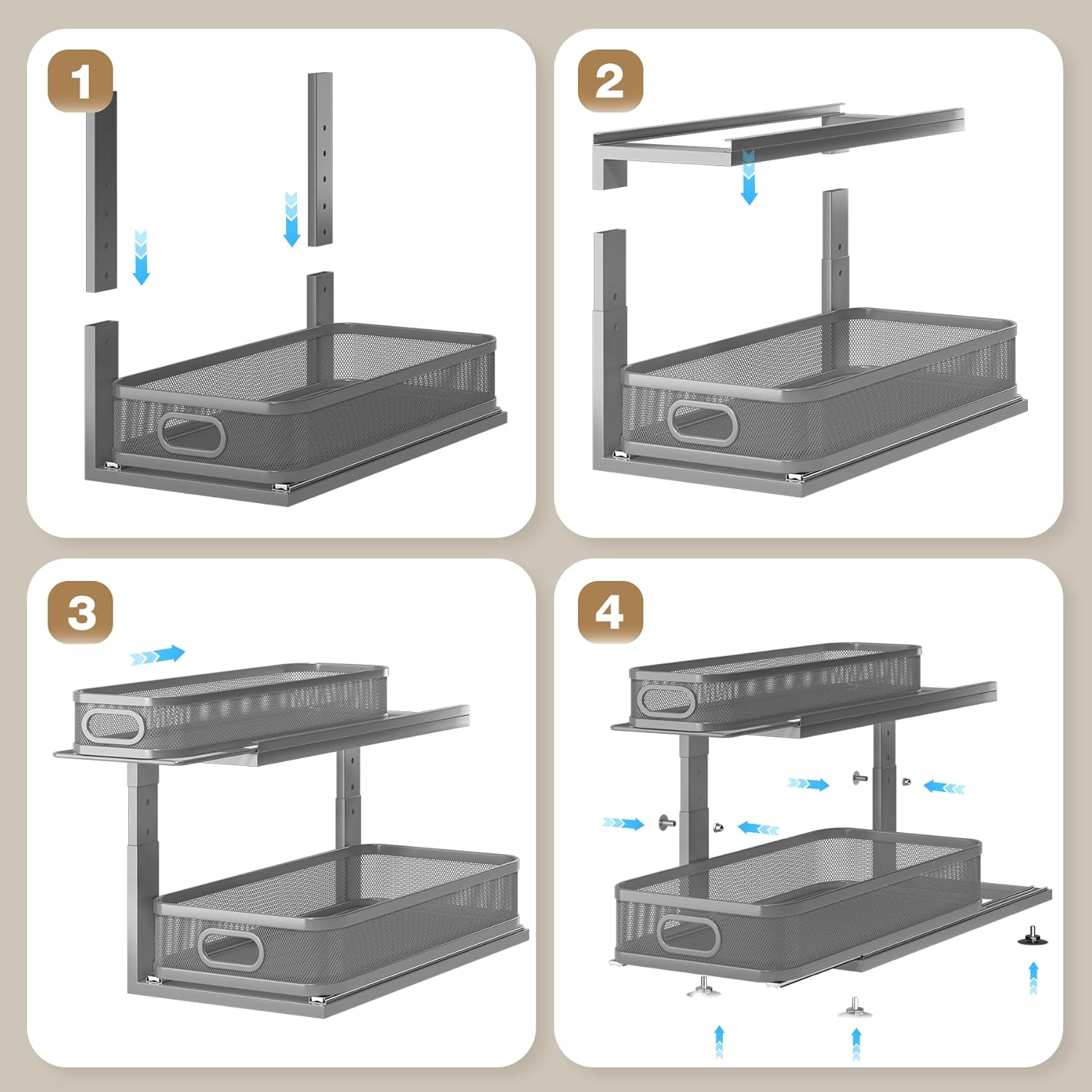 - 【Chic & Precision Mesh Fits Small Items】Under cabinet organizer features a sleek, modern mesh design that stores large bottles while neatly holding smaller items, preventing them from slipping through gaps. Style and practicality blend seamlessly into your space.
