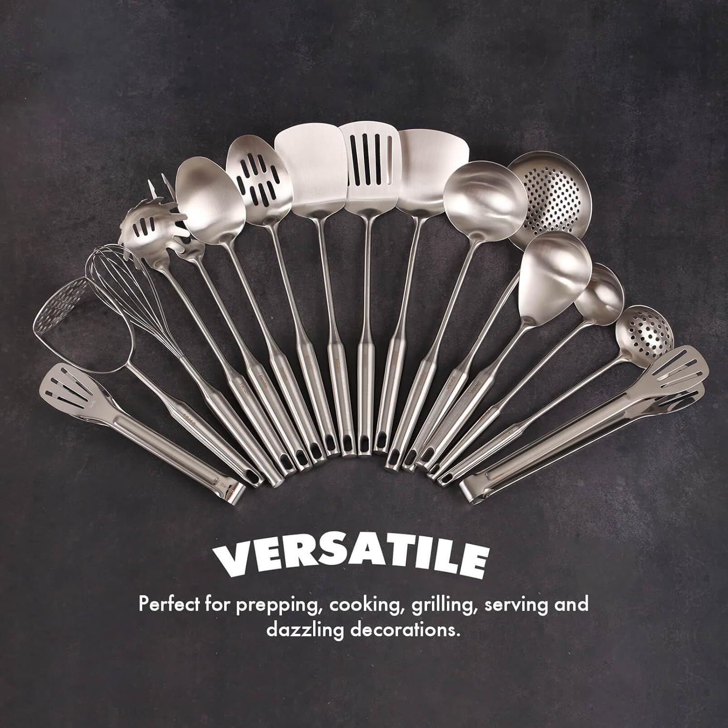 18/10 Stainless Steel Cooking Utensils Set - 16 PCS All Metal Kitchen Tools, Serving Utensils - Whisk, Masher, Fork, Tongs, Solid/Slotted Spoon, Spatula, Turner, Ladle, Skimmer, Pasta, Large Spoon Set
