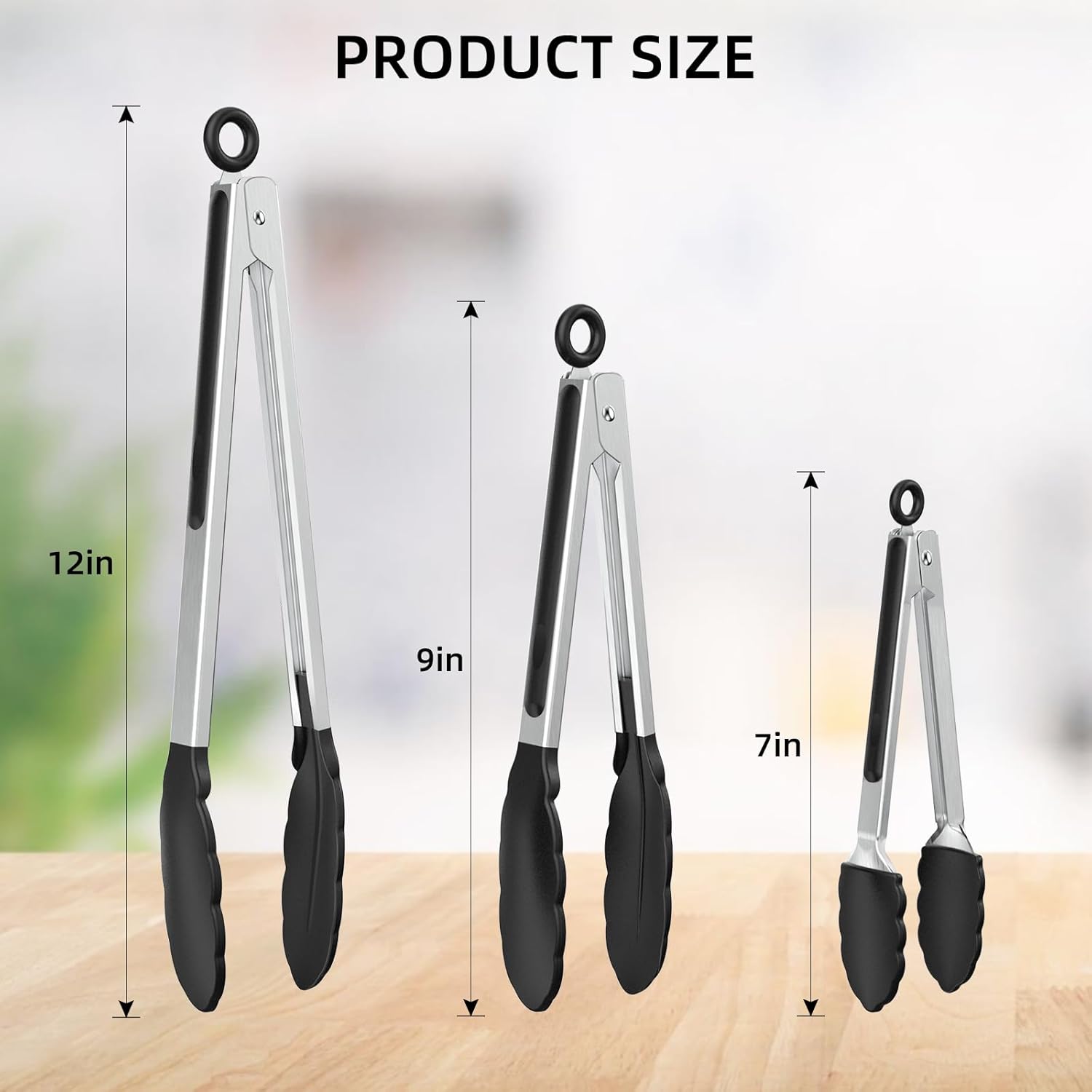 NileHome Tongs for Cooking, Professional Stainless Steel Cooking Tongs – Heat-Resistant for Grilling, BBQ, Serving Salad, Pasta, and Kitchen Use, Dishwasher Safe, Set of 7" 9" 12", Black