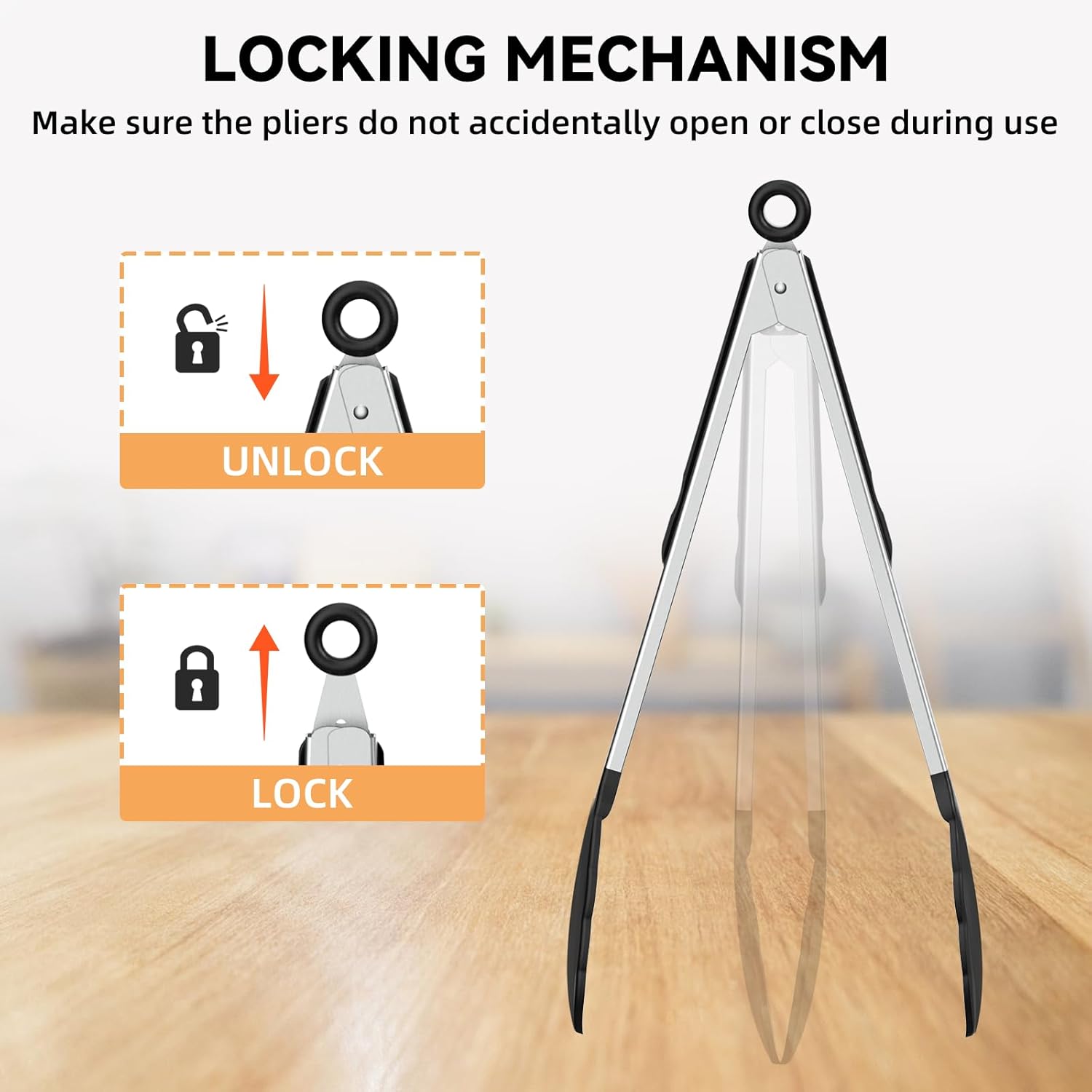 - EASY TO STORE: Kitchen tongs have a locking mechanism to ensure that the tongs will not be accidentally opened or closed during use, pull the ring to lock and push to unlock, giving you better control over cooking, and the operation is super simple. Hang them with the hanging ring after use or lock them by pulling the ring and put them in the drawer, saving space.