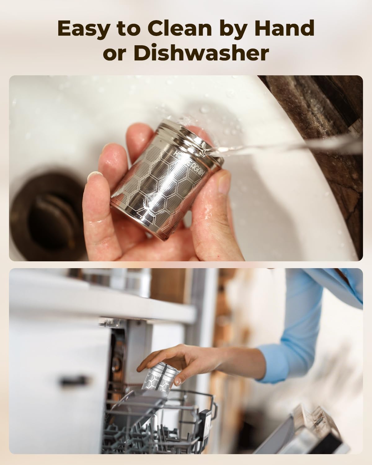 - Easy to Use & Clean: Our updated threaded lid screws on effortlessly, ensuring a tight, secure seal to lock in all tea particles— leaving no particles out of the top during brewing! After use, these loose tea strainers clean up quickly with water or in the dishwasher