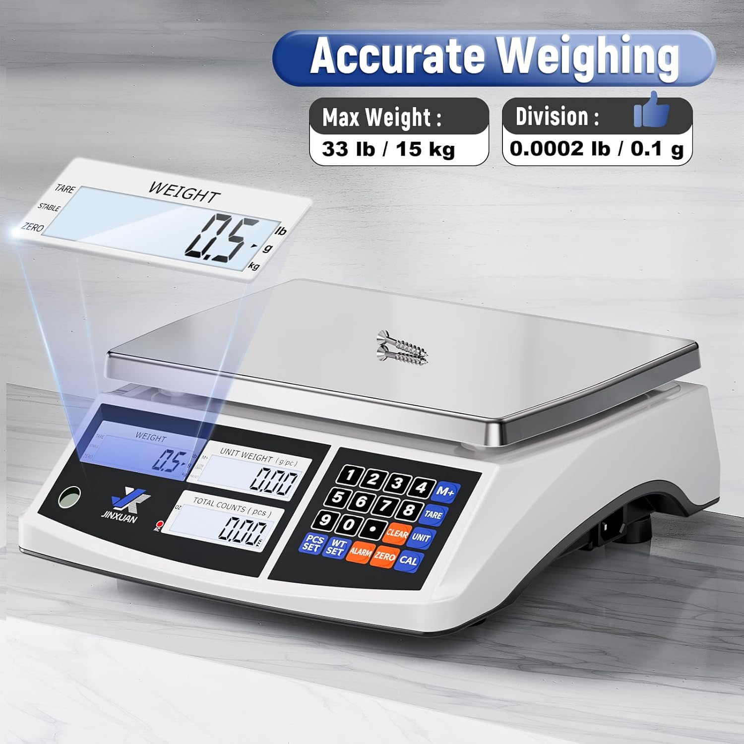 Industrial Counting Scale Digital Bench Scale lb/g/kg/oz Electronic Inventory Scale for Small Parts and Coins, 33lb/15kg Capacity Price Scale Gram Scale with Stainless Steel Platform LCD Display, 0.1g