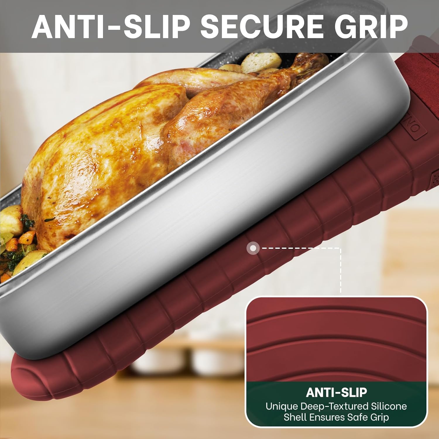 - Non-Slip Flexible Grip: These silicone oven mitts features a deep-textured slip-resistant stripe pattern with a unique ergonomic arc-shaped texture design on the fingers and thumbs, allowing the mitts moves with your hands better, delivering a slip-proof grip and safe control to grab, lift, and maneuver hot oil cooking pans and heavy oven racks