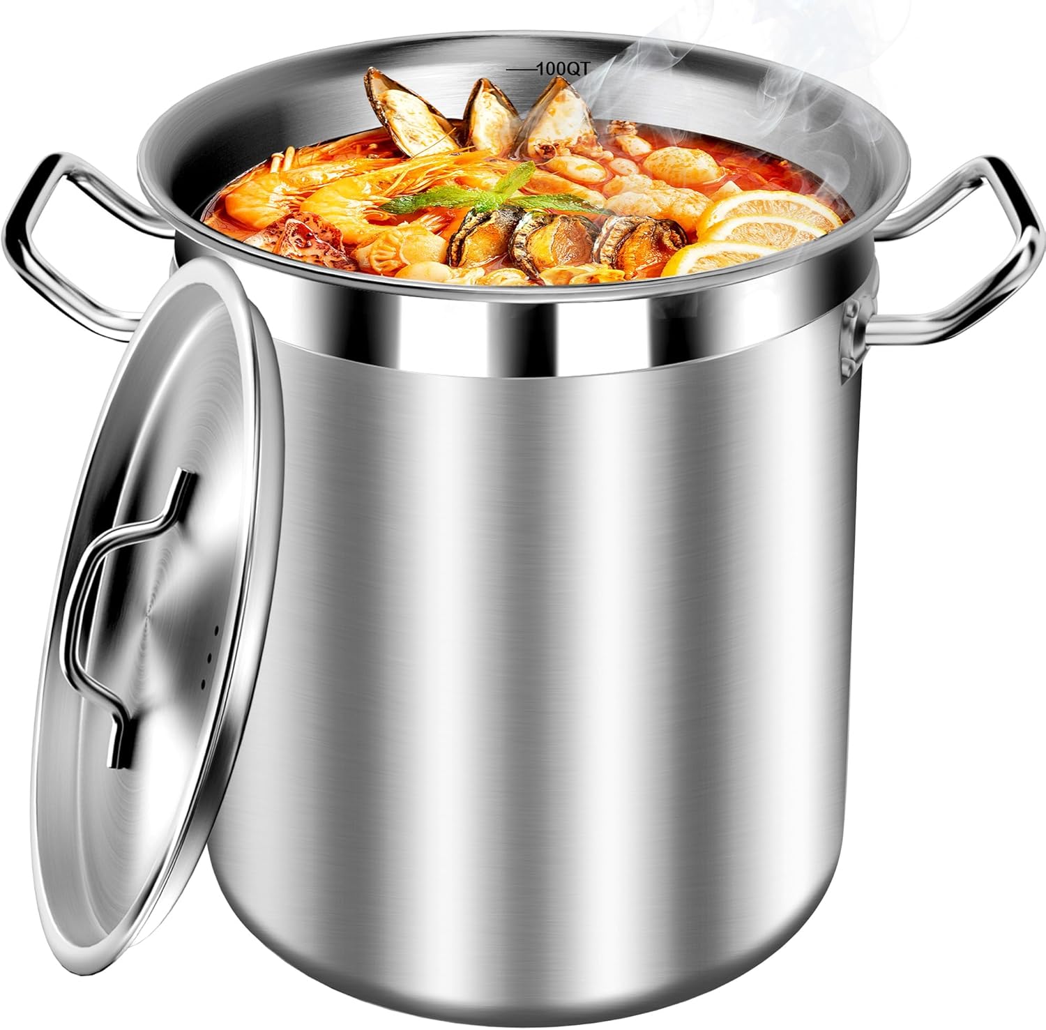 Extra-Large Stainless Steel Stock Pot – Commercial Heavy Duty Soup Pot with Lid, 3-Ply Base for Fast Heating, Ideal for Seafood Boils and Outdoor Cooking - 100 Quart