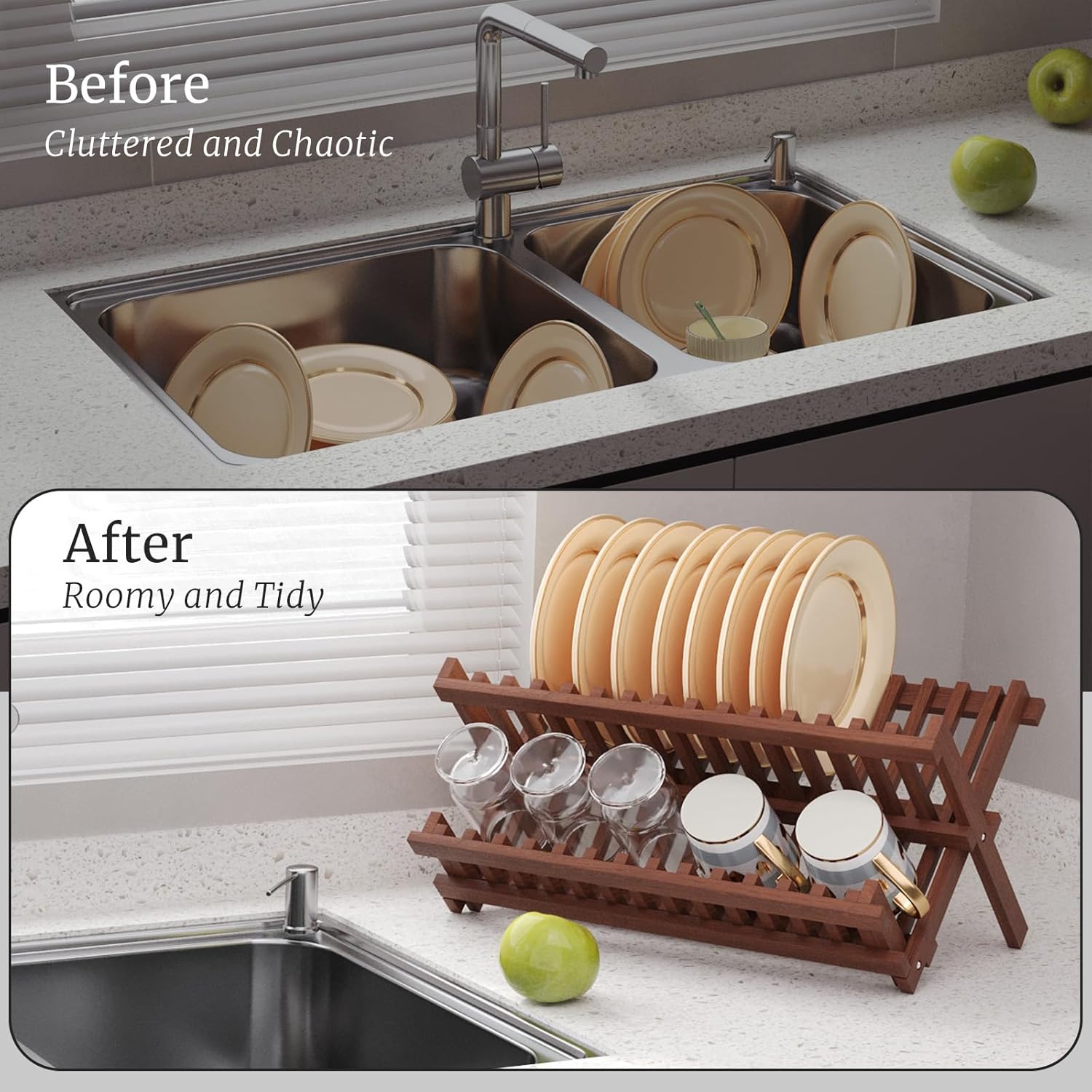 Teak Dish Drying Rack,Folding Collapsible Drainer Plate Organizer Holder for Kitchen,Foldable Spice Rack for Countertop and Cabinet,Pantry Organization and Storage