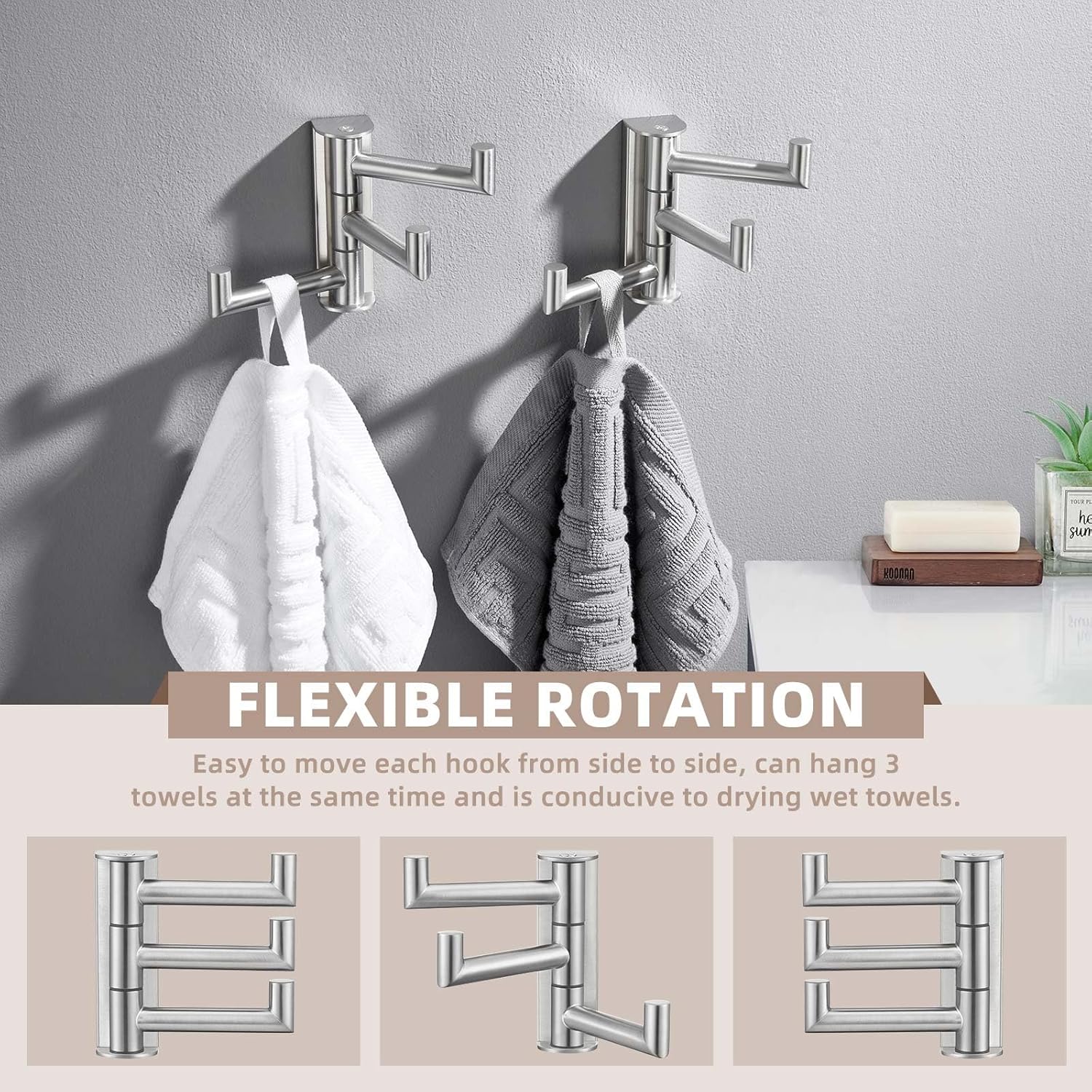 Suyar Towel Hook for Bathroom, SUS 304 Stainless Steel Swivel Robe Holder with 3 Arms, Wall Hook Brushed Nickel, 2 Pack