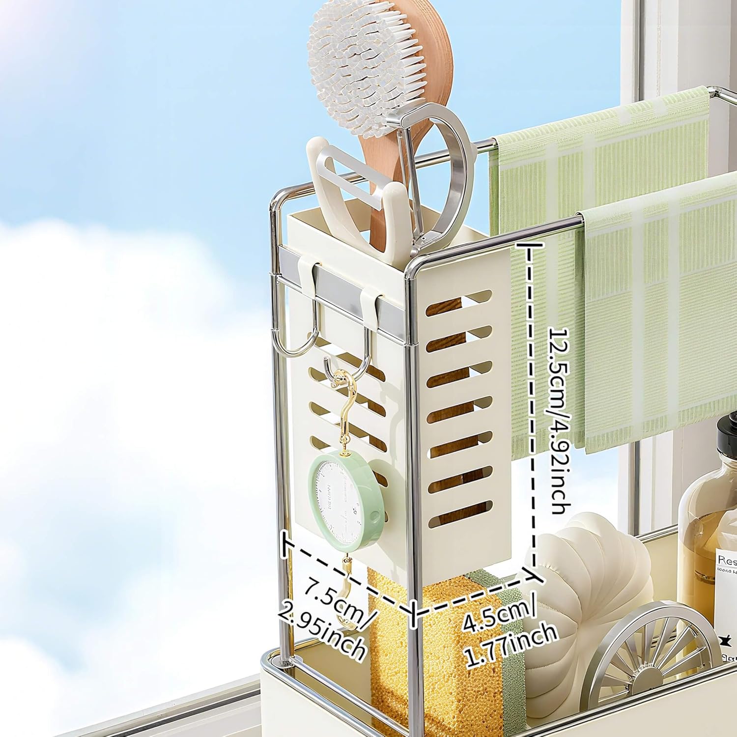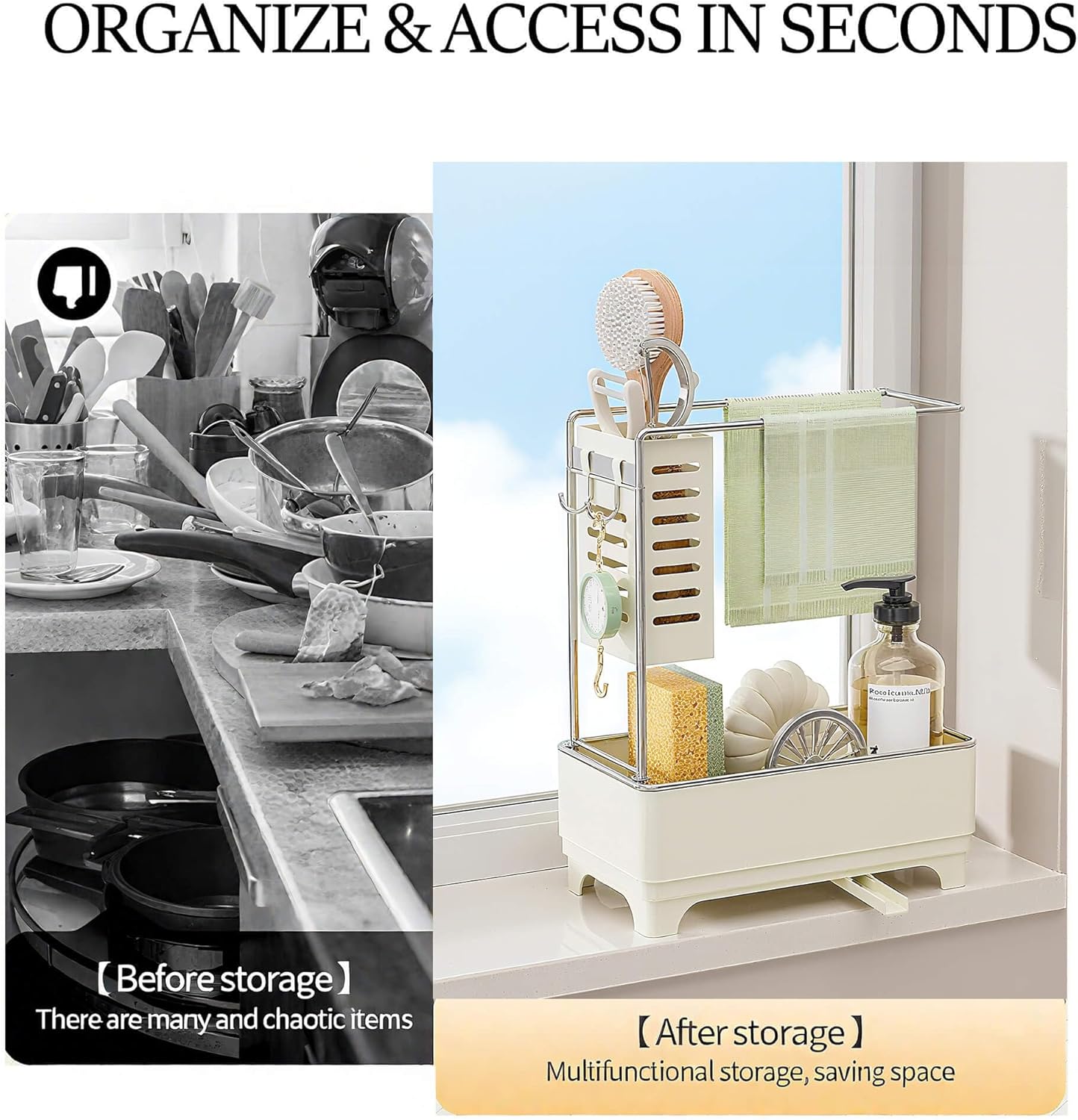 - Organize & Access in Seconds: This 2-tier sink caddy organizer maximizes vertical space to neatly hold dishcloths, sponges, brushes, scrapers or towels, and even small utensils with built-in hooks—keeping your kitchen sink area clutter-free. No more scattered cleaning tools; everything stays within arm’s reach while washing dishes