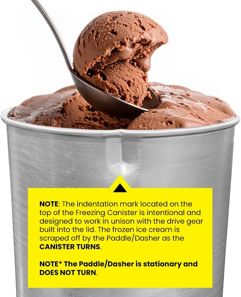 - CLEANUP IS EASY: The aluminum canister allows for easy wiping away of messes, cleanup afterwards is a cinch. Easily store leftover ice cream in your freezer, plus included is a see-thru lid that fits right on top of the ice cream canister. Dishwasher safe canister and lid.