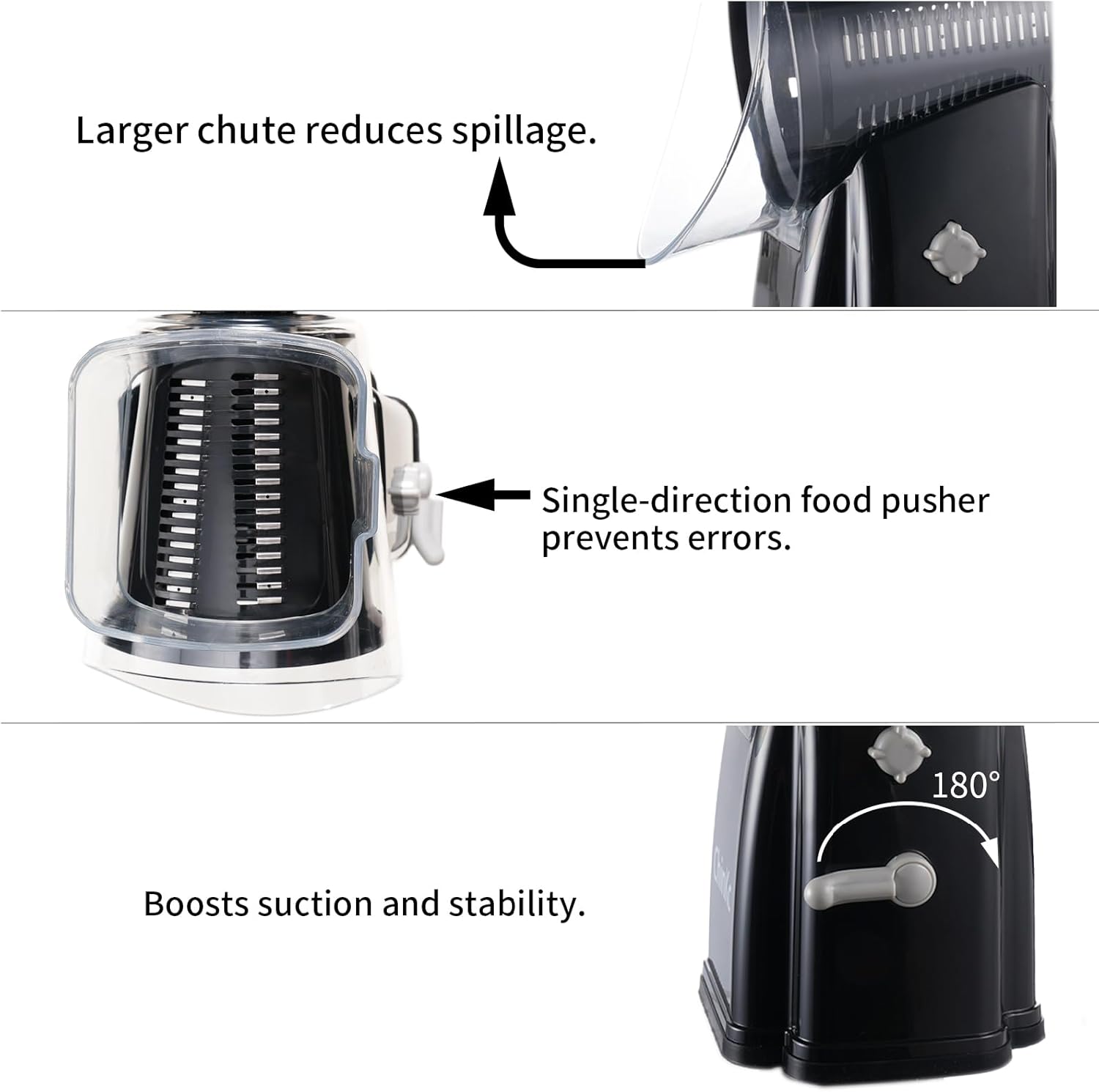 - โ Important Tipsโ : Compared with the grater currently on the market, we have made three improvements and upgrades, namely: 1. 180ยฐ Rotation boosts suction and stability. 2.Larger chute reduces spillage. 3.Single-direction food pusher prevents errors.